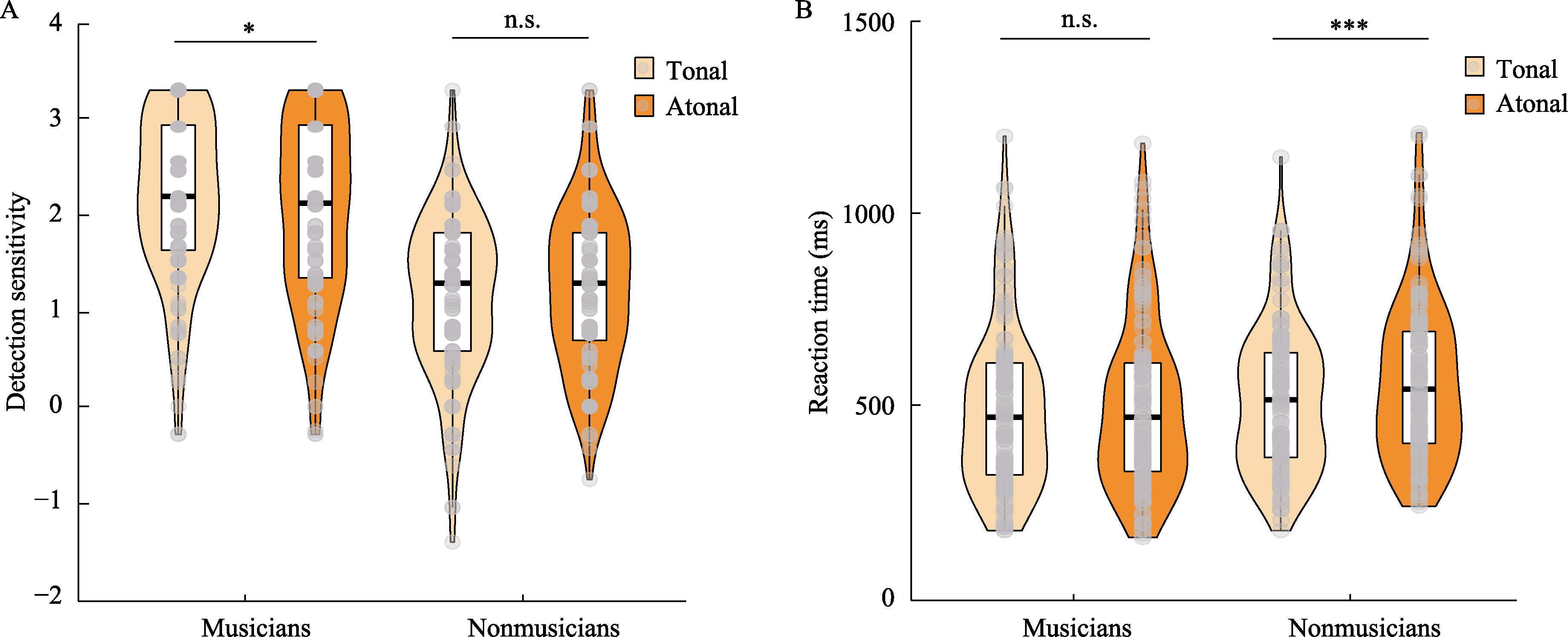 Figure 5. (A) Detection sensitivity and (B) reaction time for tonal and atonal conditions in musicians and nonmusicians in Experiment 2. Note. The horizontal line within each box represents the median; box length indicates the interquartile range. The violin plots illustrate the distribution of participant data, with gray dots representing individual participants. * p < 0.05, *** p < 0.001