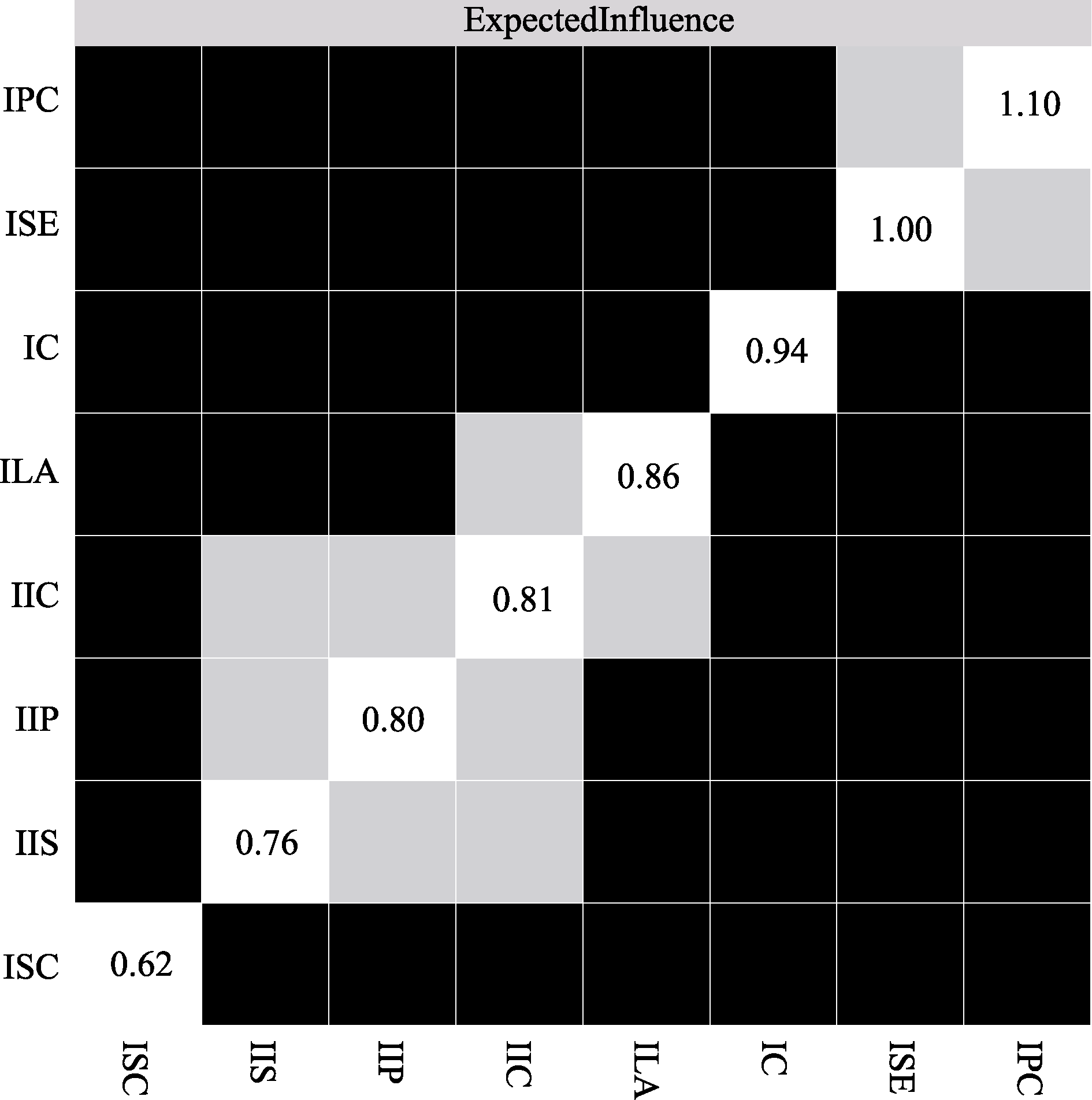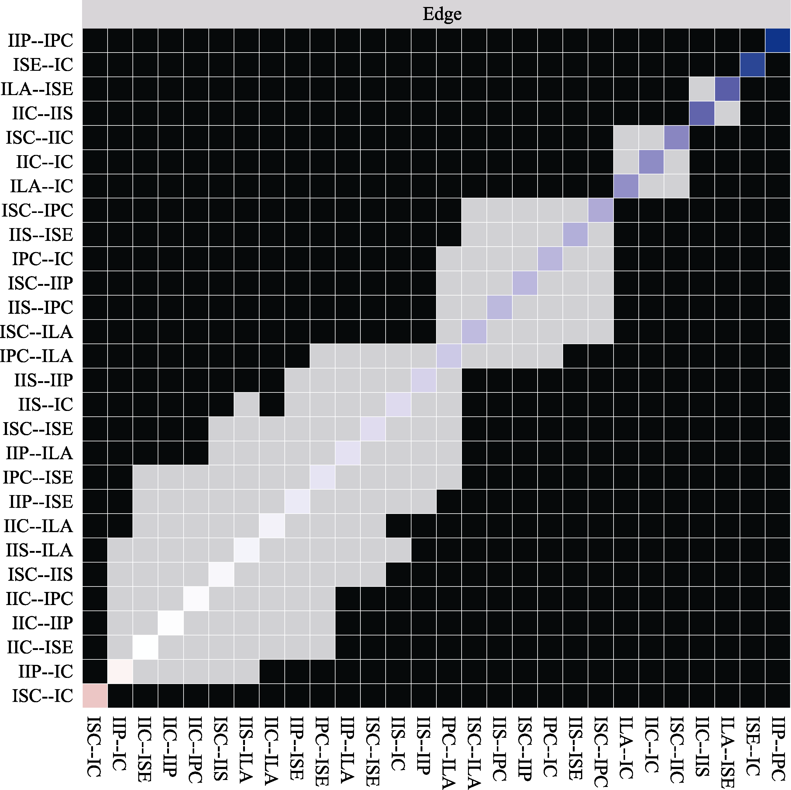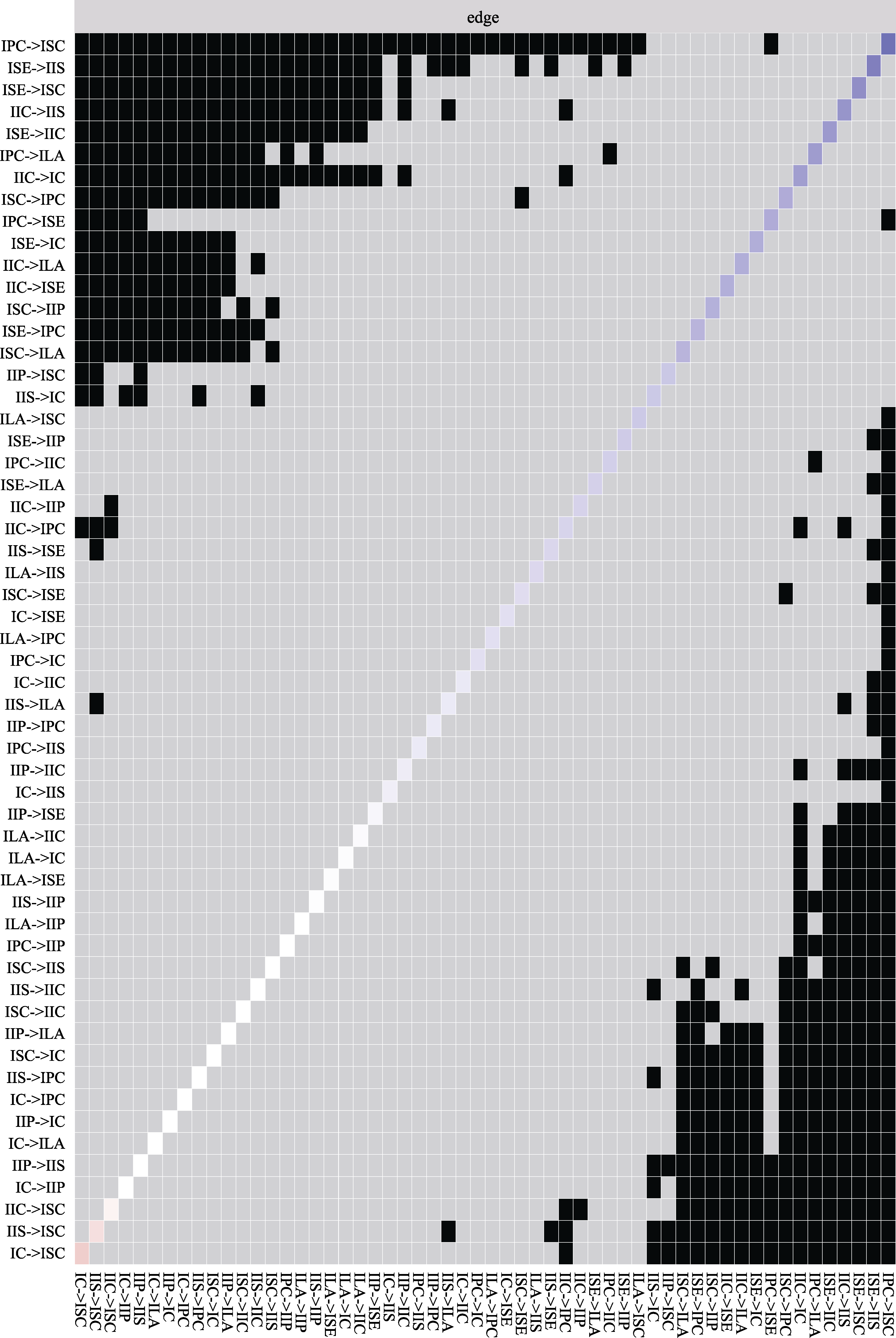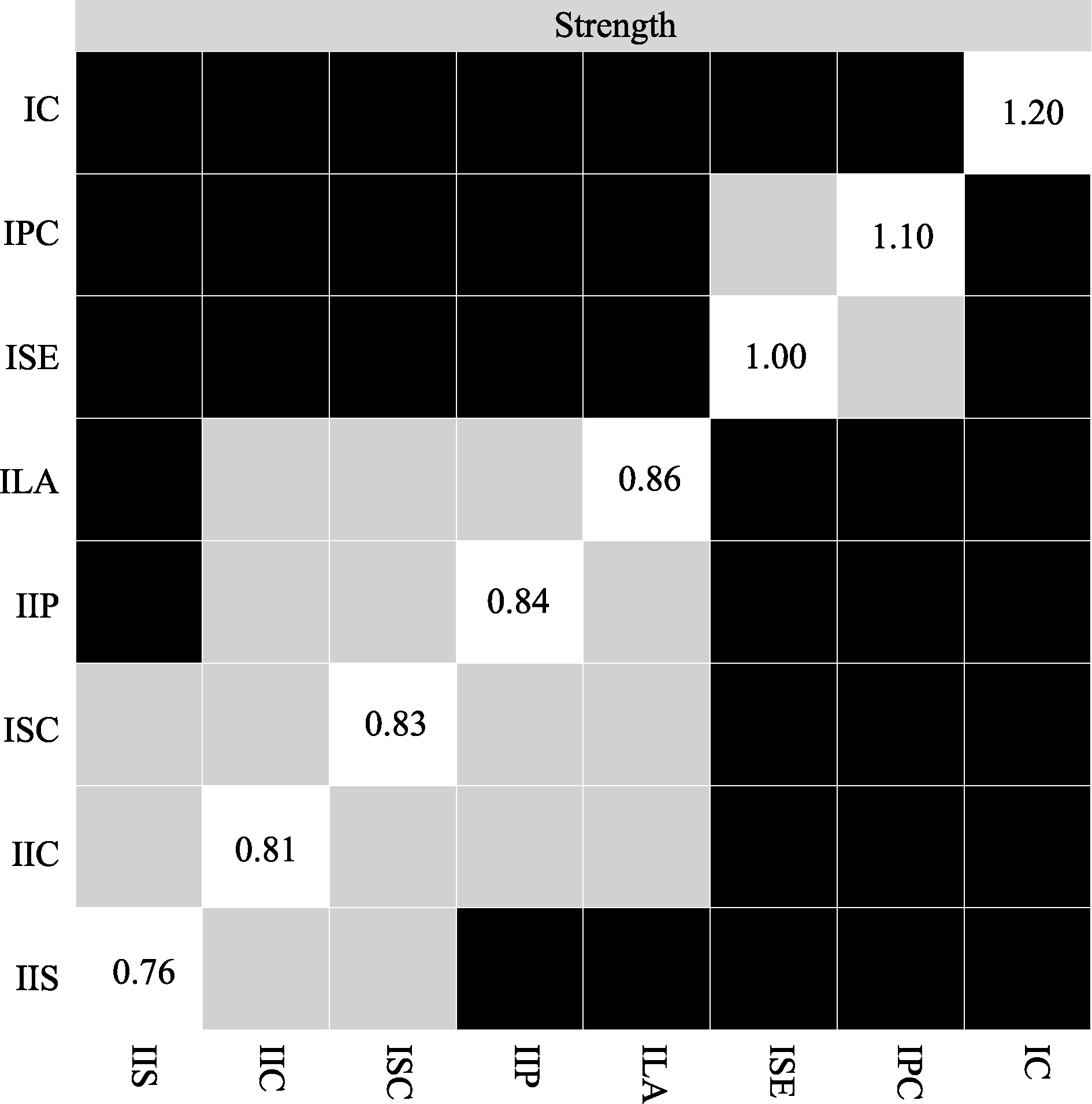 Figure S1. Nonparametric bootstrap method for testing network adaptation to the strength difference of individual nodes of the transect network. Note. Black squares in the figure indicate that the 95% confidence interval corresponding to the difference in the strengths of the two nodes derived from the bootstrap method does not contain zero, while gray squares indicate that the 95% confidence interval corresponding to the difference in the strengths of the two nodes contains zero. The diagonal lines indicate the magnitude of the individual node intensities (below).