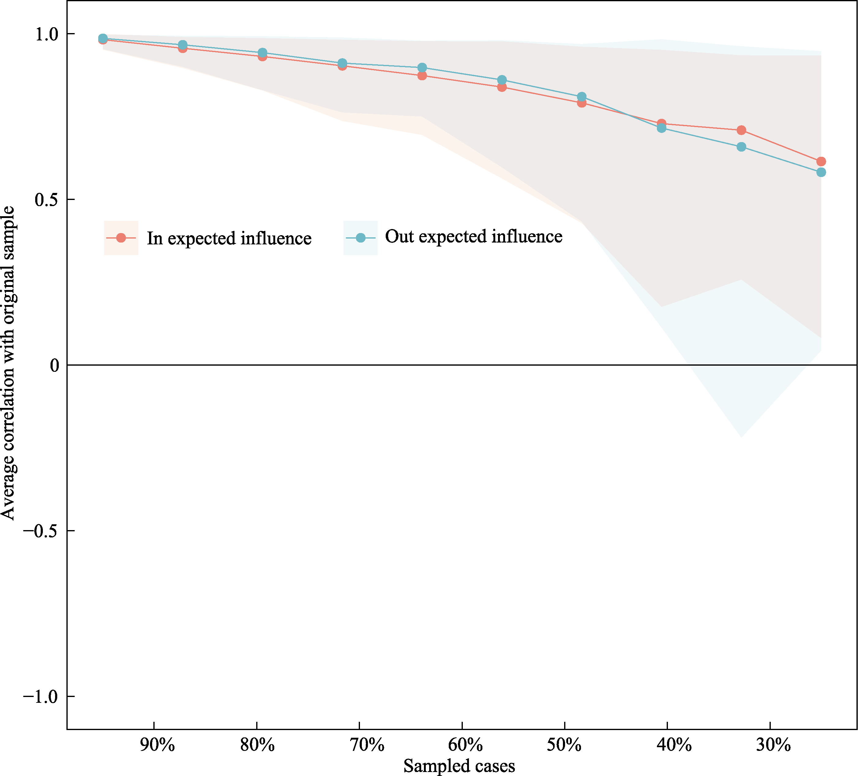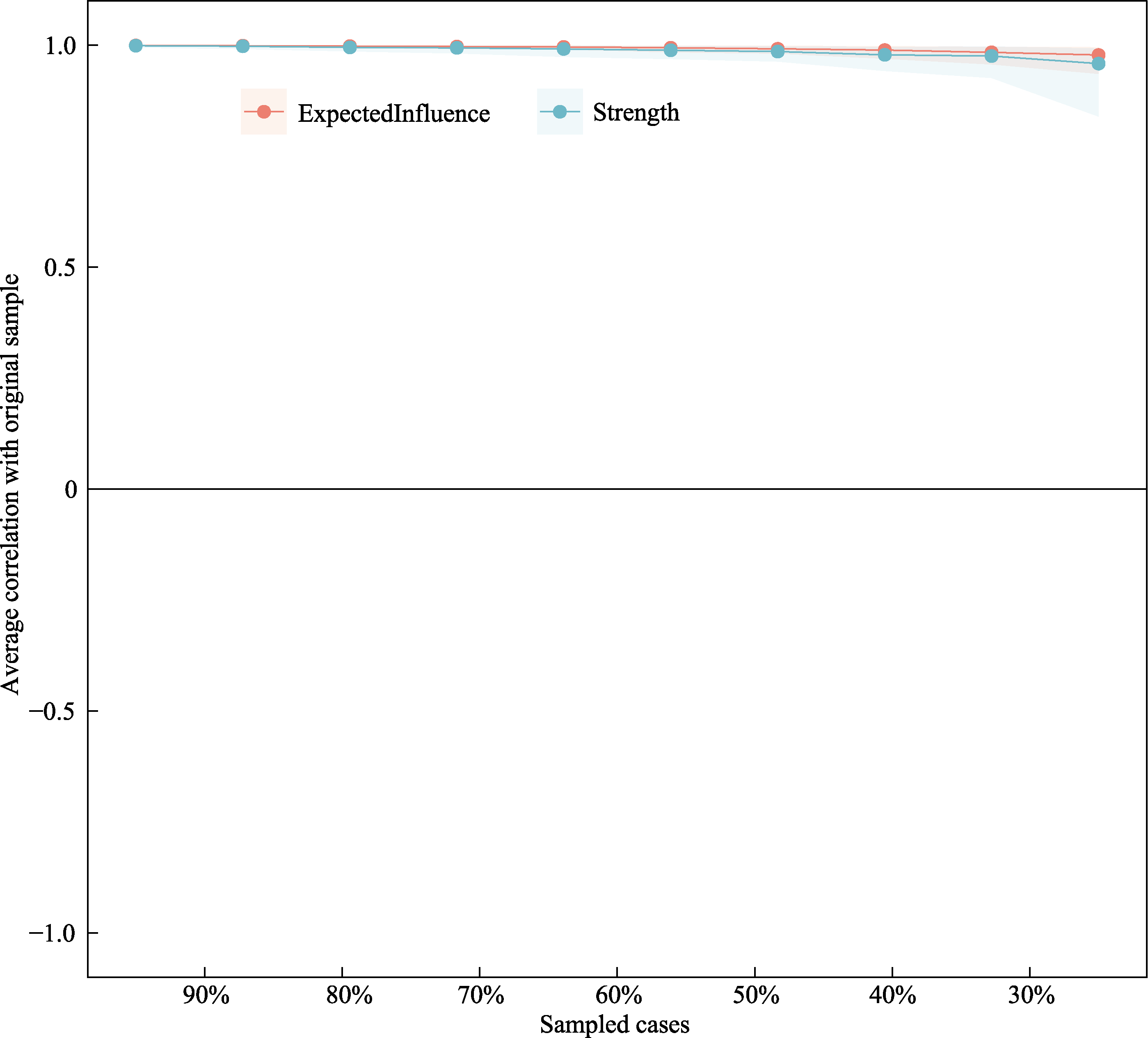 Figure S3. Stability test results of the Case-droping method for testing network adaptation to intensity and expected impacts in the transect network Note: The X-axis indicates the percentage of remaining after randomly dropping samples on the original sample; the Y-axis indicates the correlation of the centrality metrics between the remaining samples and the original sample. Points on the lines in the figure indicate the average correlation (from 90% to 10%) between the intensity estimated in the full sample and the intensity estimated on a random subsample that retains only a percentage of cases. Shaded areas indicate 95% bootstrap confidence intervals for the correlation estimates. Higher values indicate better stability of the centrality estimates. (below)