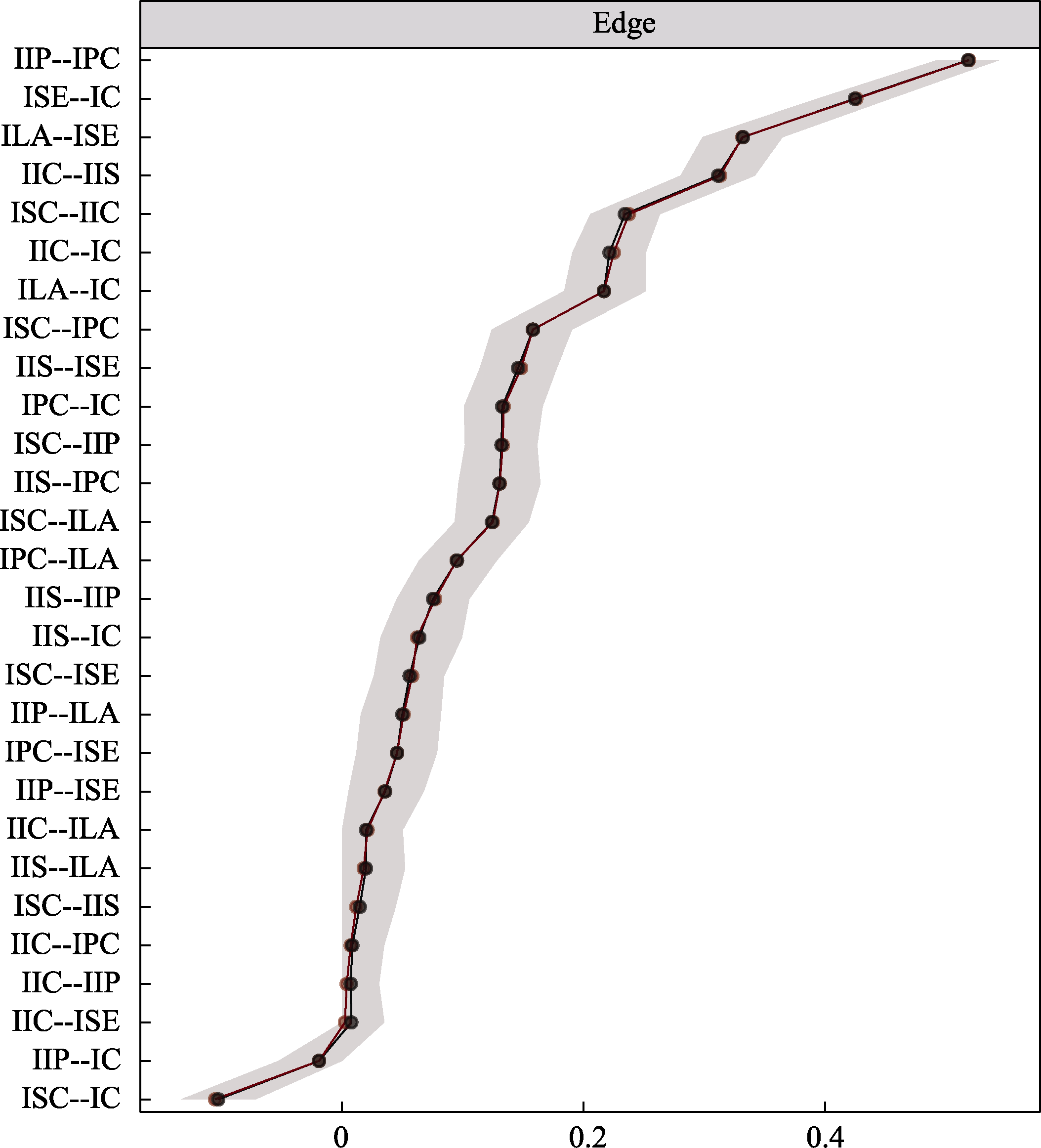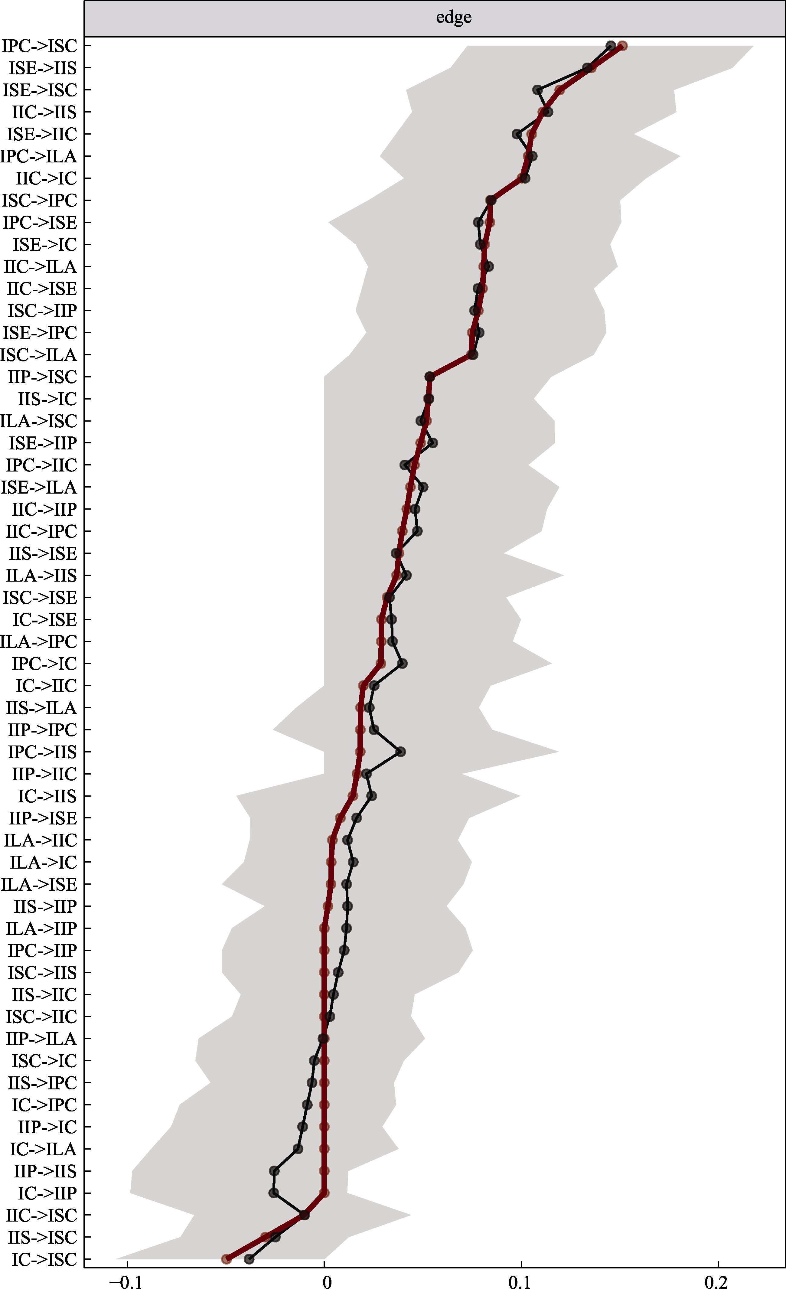 Figure S5. Nonparametric bootstrap method to test the accuracy of marginals estimation in network-adapted transect networks. Note. The red and black dots on each horizontal line indicate the sample values and the estimated bootstrap means of the marginals, respectively. The shaded portion of each horizontal line is the 95% confidence interval of the bootstrap estimate of the marginals, and the narrower gray shading means the higher accuracy of the marginals. (Same below)