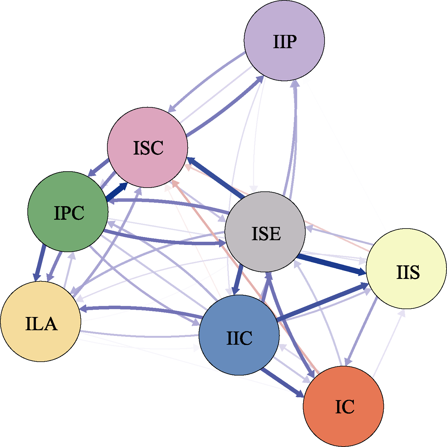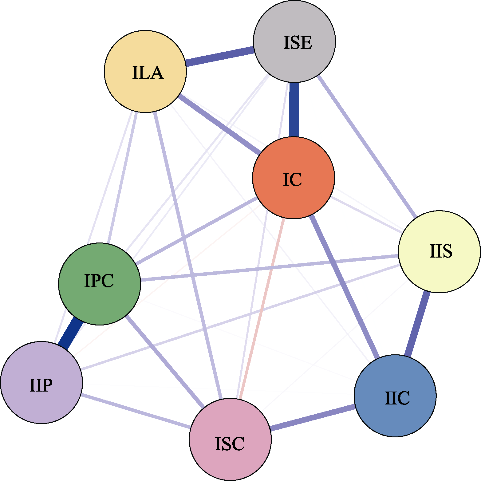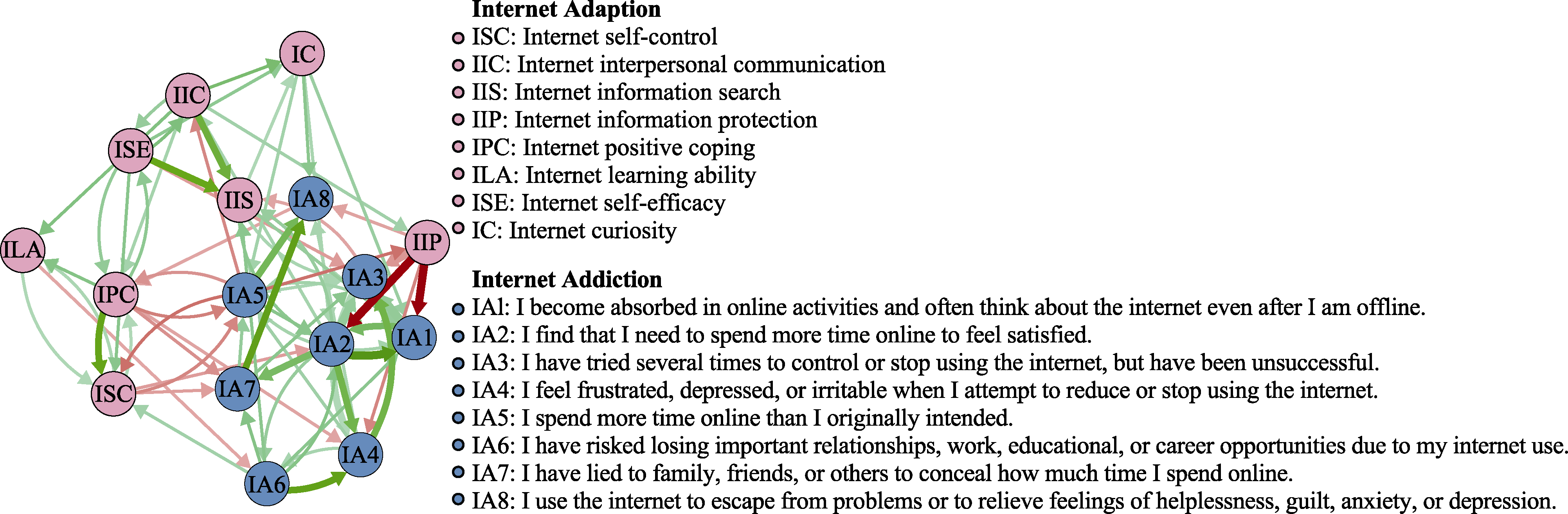 Figure 2. Regularized partial correlation network of internal dimensions of internet adaptation. Note. The thicker the edge, the stronger the conditional correlation between nodes. Blue edges indicate positive relationships, and red edges indicate negative relationships. For a color version, please refer to the electronic version.