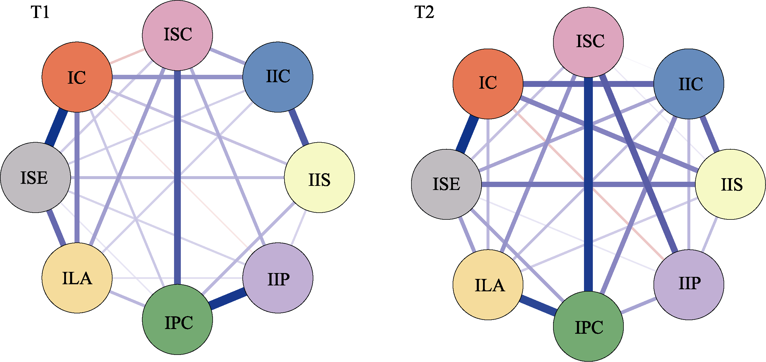 Figure 7. Cross-lagged network model of T1 internet adaptation and T2 internet addiction. Note. The model represents the temporal interactions between internet adaptation and internet addiction over two time points.