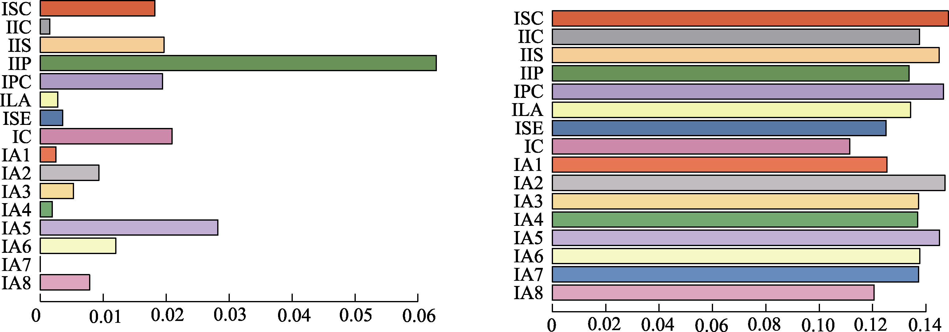 Figure 8. Cross-cluster outgoing predictability (left) and incoming predictability (right) in the cross-lagged network of internet adaptation and internet addiction.