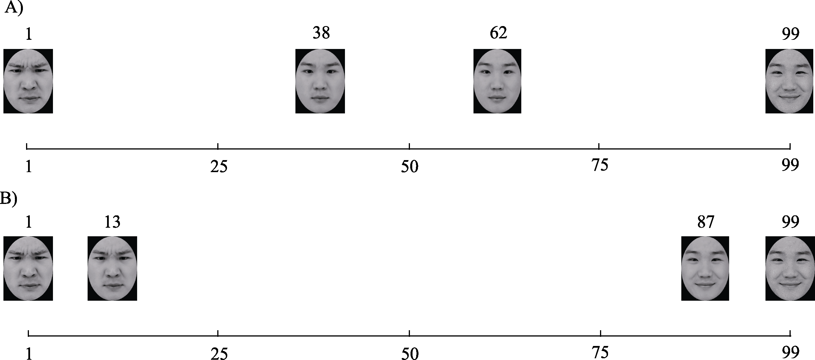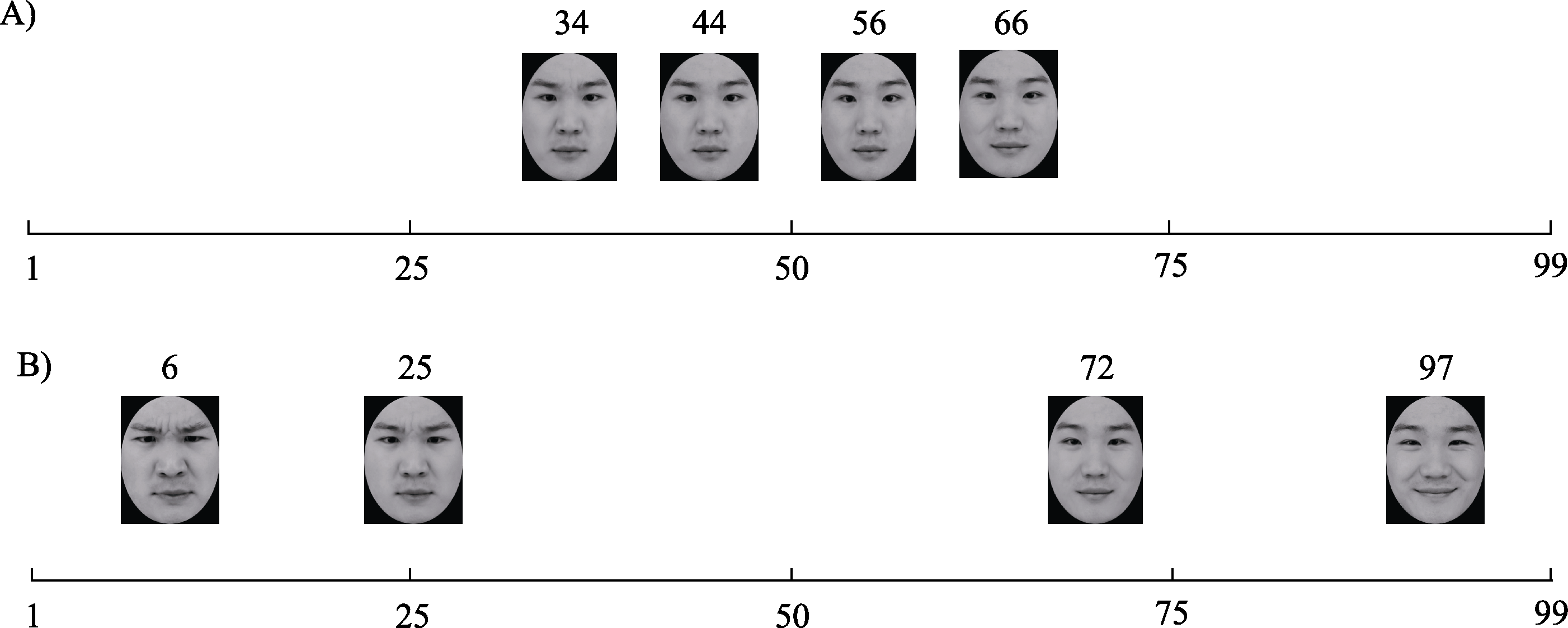 Figure 7. An example of the face materials in Experiment 3. A) is the set of faces with low emotional variability, and B) is the set of faces with high emotional variability. In both the high and low emotional variability conditions, the mean emotional was neutral (50).