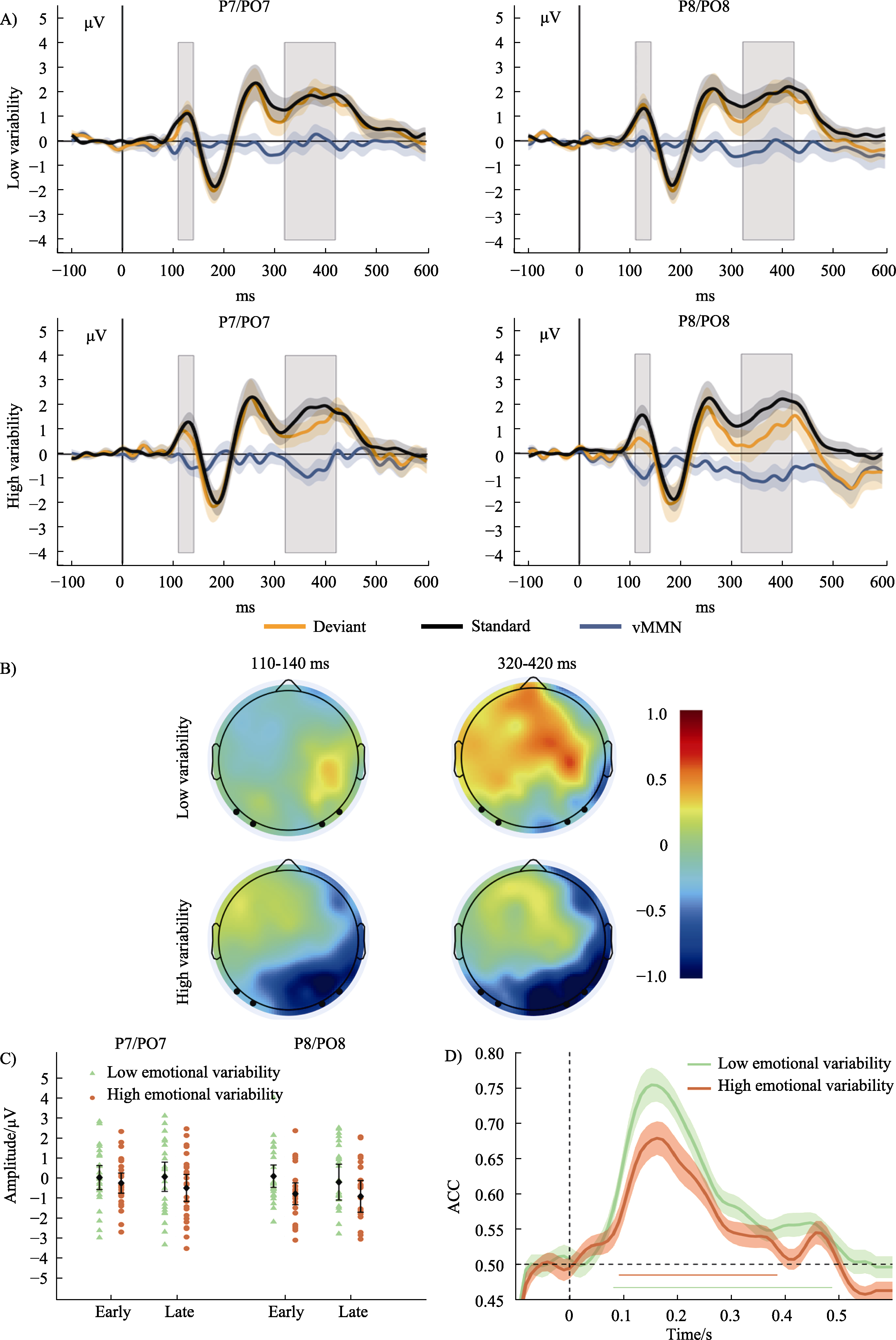 Figure 8. A) ERP waveforms in Experiment 3. Difference wave refers to the ERP evoked by the deviant stimulus minus the ERP evoked by the standard stimulus, and the shaded area is the time window of interest (110−140 ms and 320−420 ms). B) Topographic map of the difference wave in Experiment 3. The mean amplitude of the electrodes marked on the topographic map was used to map the ERP waveforms in this brain region, as well as for statistical analyses. C) Mean vMMN (ERP induced by deviant stimulus minus ERP induced by standard stimulus) amplitude of the electrodes analysed around 320−420 ms for the high and low emotional variability conditions in Experiment 3. Each point represents the mean amplitude of one participant in that condition, and the black diamonds and the error bars represent the mean and 95% confidence intervals for each condition. D) Decoding results of ERPs in Experiment 3. Horizontal lines near the x-axis are the time windows in which decoding accuracy was greater than chance level (p < 0.05).
