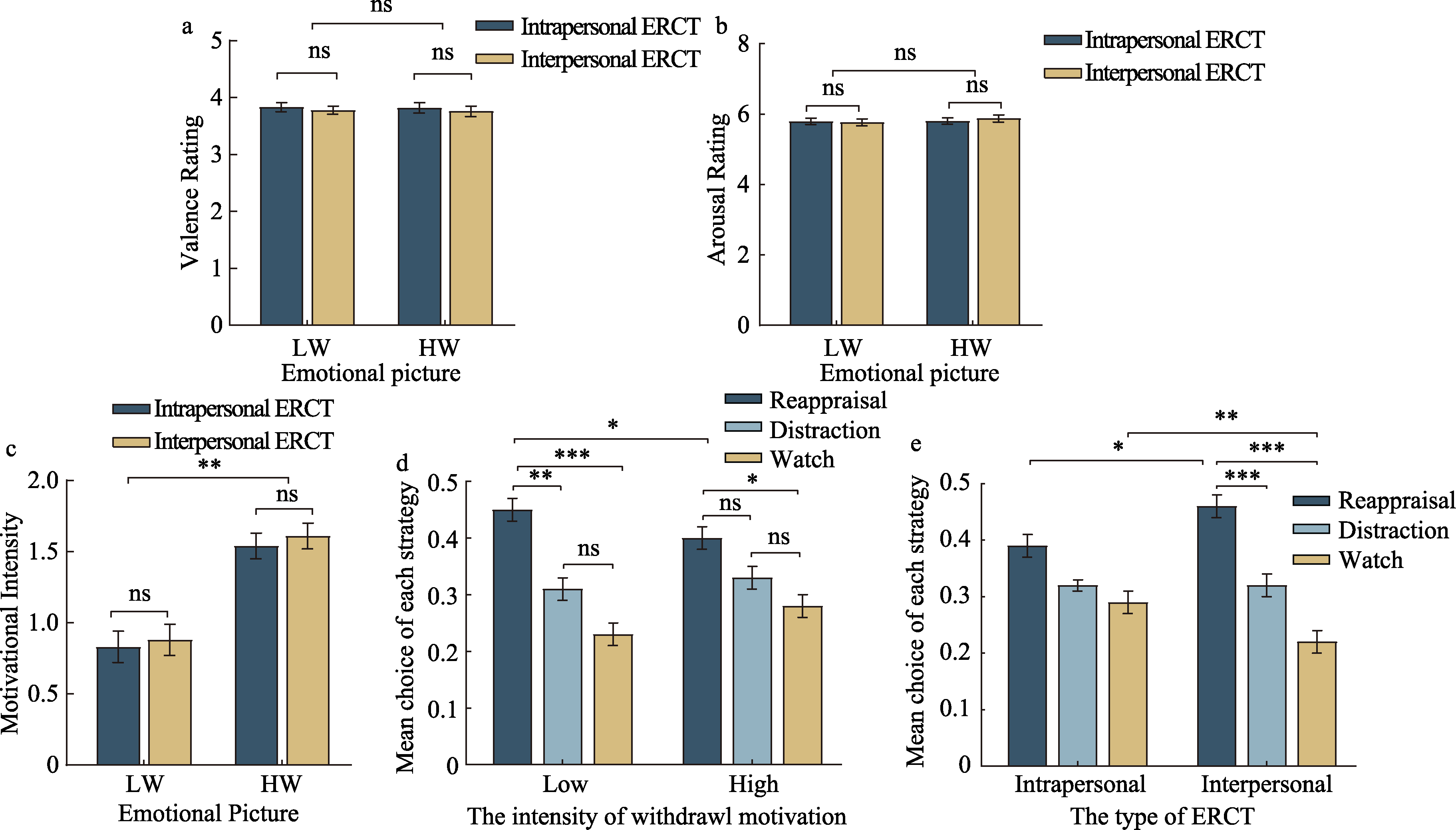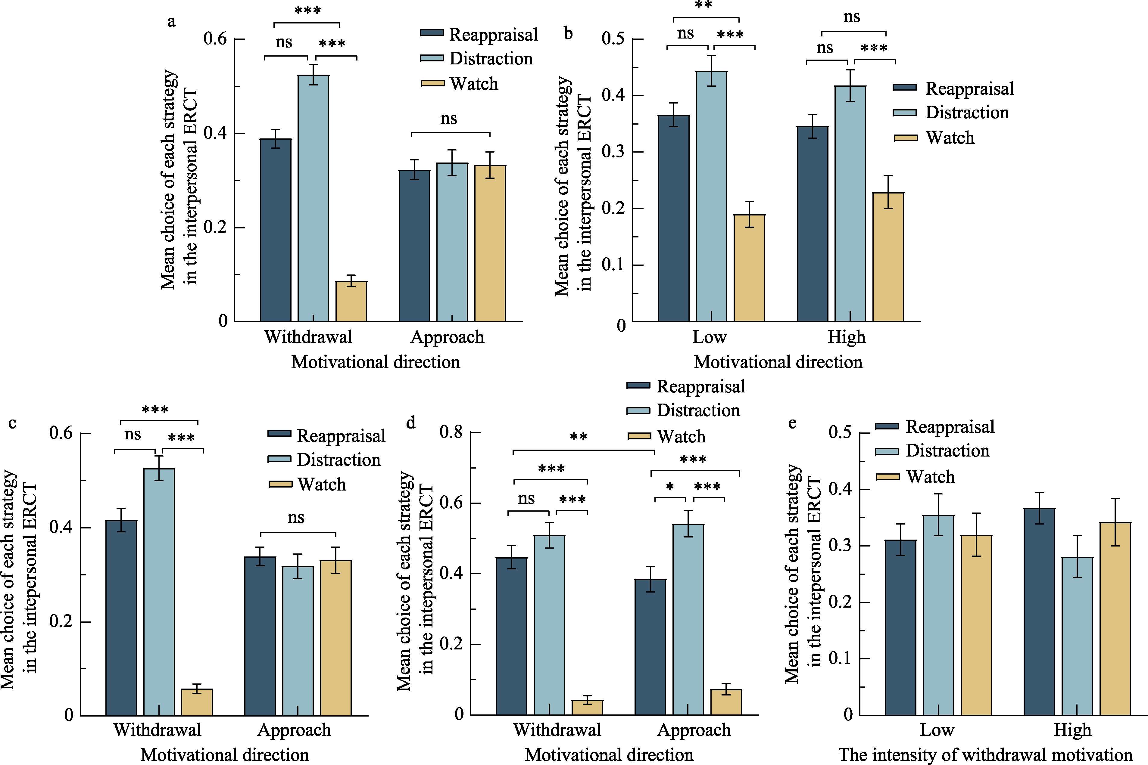 Figure 5. (a-c) show the results of emotional induction validity tests. (d) presents the effect of withdrawal motivation intensity on strategy selection, and (e) shows the strategy selection results of regulators in different ERCT. ***p < 0.001, **p < 0.01, *p < 0.05, ns: p > 0.05; bar: standard error (SE), and the same applies hereinafter.