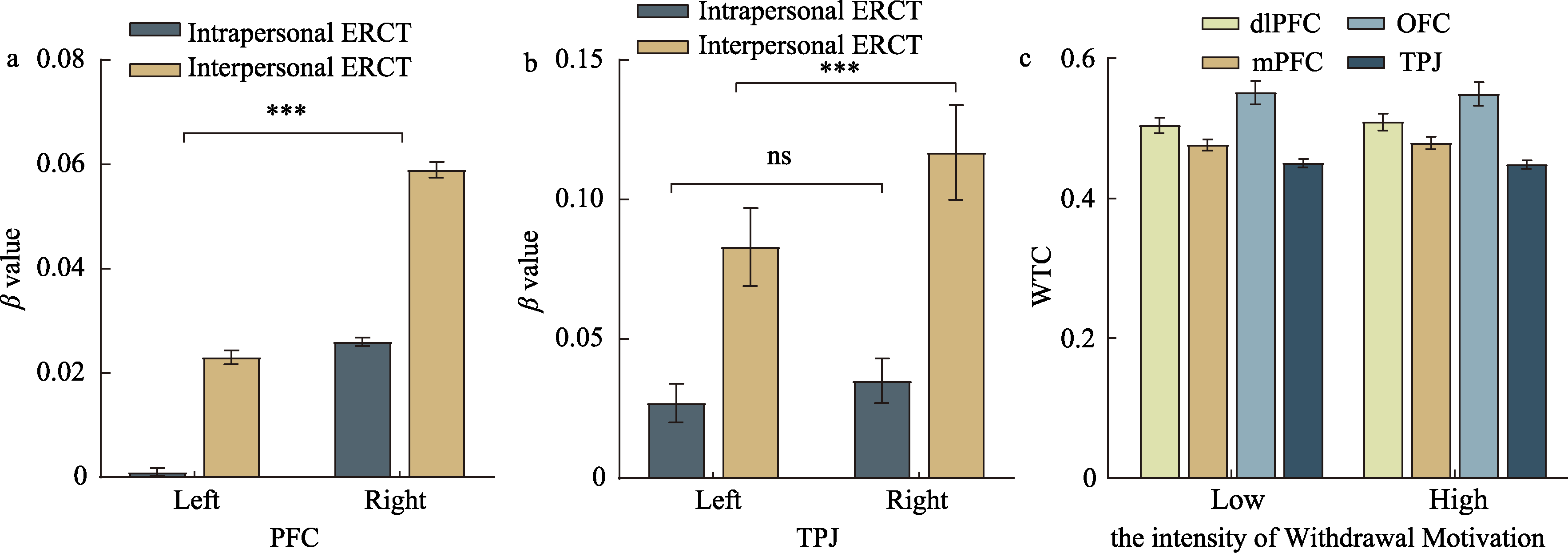 Figure 7. NIRS Imaging Results of Study 2. (a) and (b) show the activation levels in the prefrontal cortex (PFC) and temporoparietal junction (TPJ) of regulators during the stimulus presentation phases of the two task components. (c) depicts the inter-brain synchrony levels between regulators and targets during the stimulus presentation phase of the interpersonal ERCT under different avoidance motivation intensity conditions.