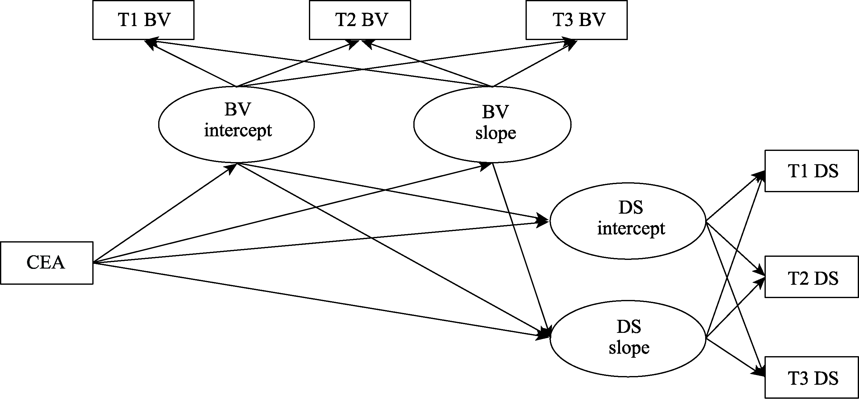 Figure 1. Hypothesized sequential mediation model. Note: CEA = childhood emotional abuse, BV= bullying victimization, DS = depressive symptoms. “T1 BV” represents bullying victimization measured at point in time 1, same below.