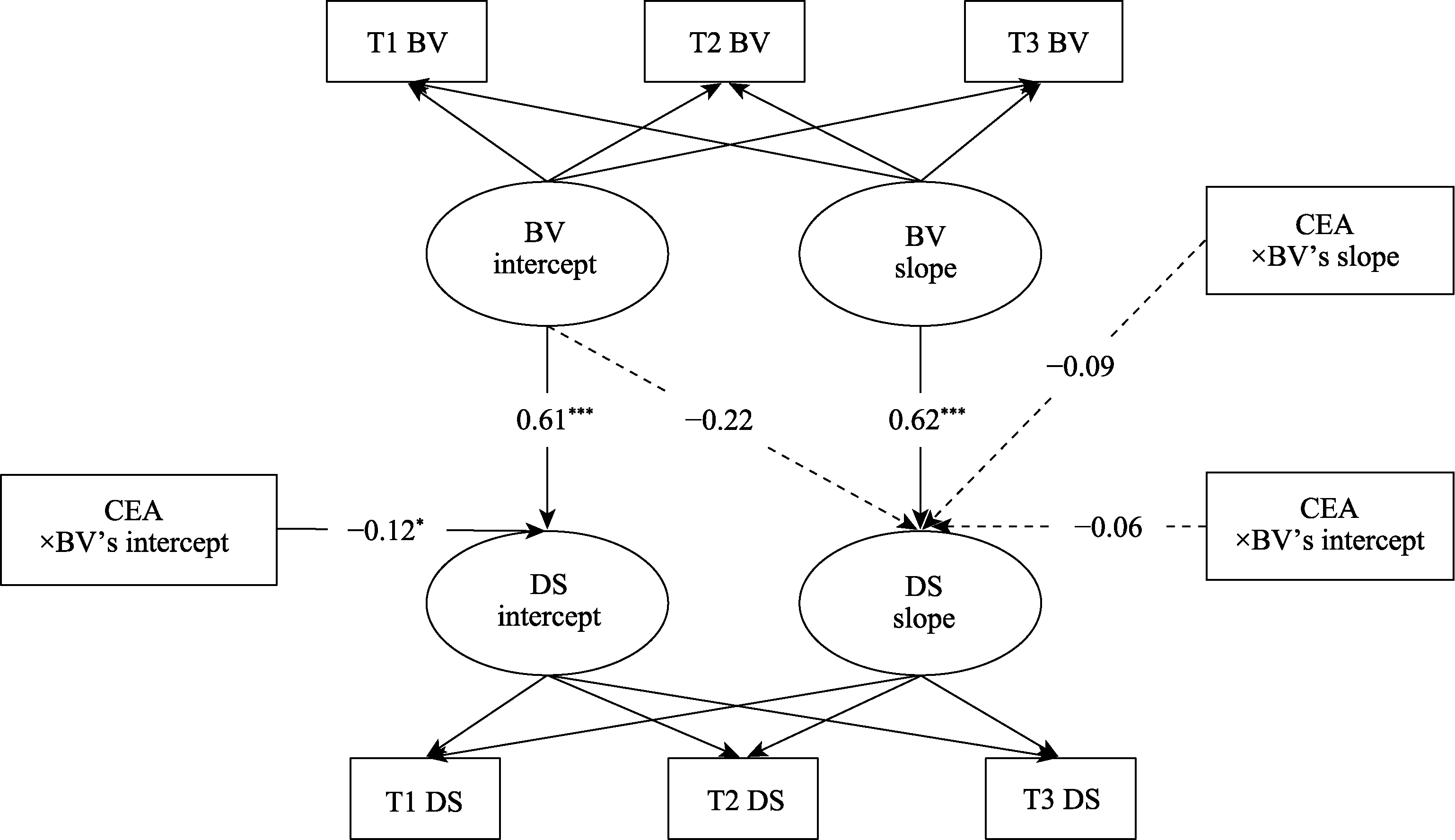Figure 7. Test results of the enhanced moderation model. Note: “CEA × BV’s Intercept” represents the interaction term between childhood emotional abuse and the initial intercept of bullying victimization; “CEA × BV Slope” represents the interaction term between childhood emotional abuse and the slope of bullying victimization growth. For graphical simplicity, only key effect values are reported in the figures, and all beta values are standardized path coefficients.
