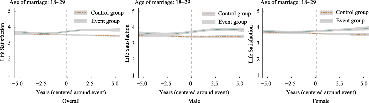 Figure 2 Trends in life satisfaction before and after marriage among individuals aged 18~29. From left to right: overall sample (regardless of gender), males, and females. The green solid bold line represents the model-estimated mean trajectory for the event group, and the red dashed bold line represents the model-estimated mean trajectory for the control group. Shaded areas around the bold lines indicate the 95% confidence intervals of the mean trajectories. Color version available in the online article (same below).