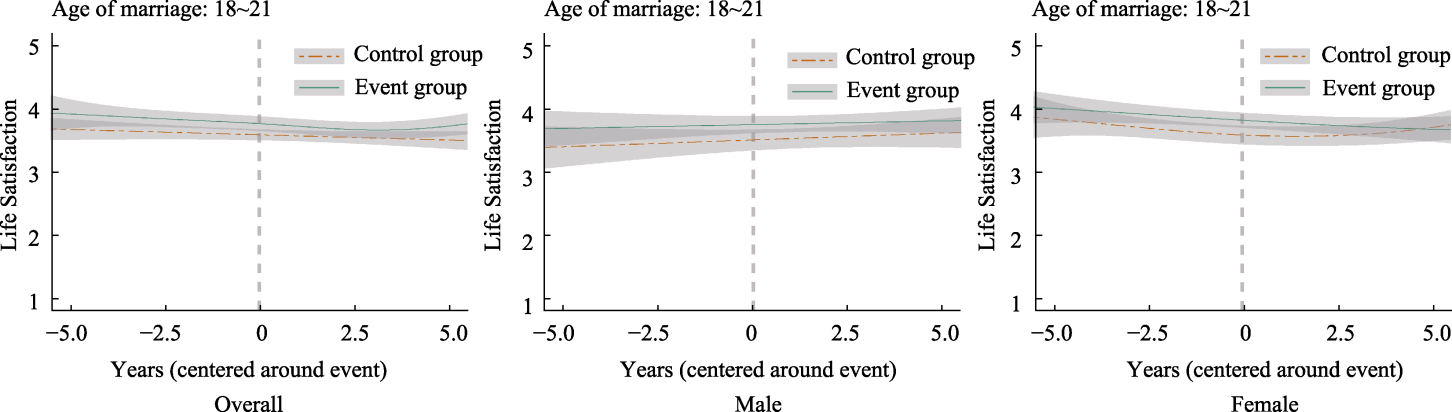 Figure 3 Trends in life satisfaction before and after marriage among individuals aged 18~21. From left to right: overall sample (regardless of gender), males, and females. The green solid bold line represents the model-estimated mean trajectory for the event group, and the red dashed bold line represents the model-estimated mean trajectory for the control group. Shaded areas around the bold lines indicate the 95% confidence intervals of the mean trajectories.