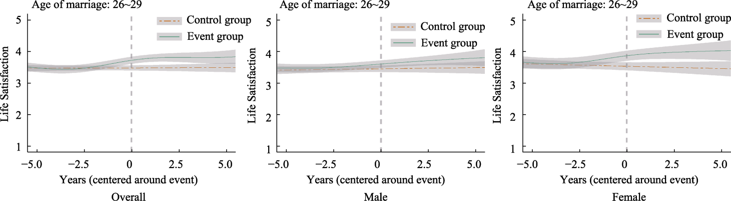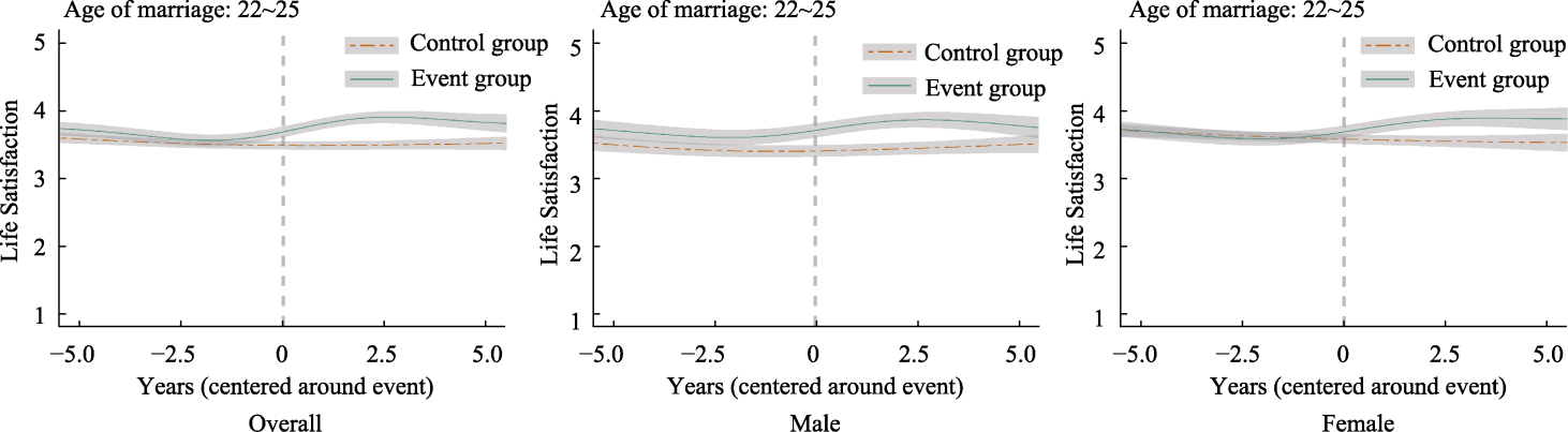 Figure 5 Trends in life satisfaction before and after marriage among individuals aged 22~25. From left to right: overall sample (regardless of gender), males, and females. The green solid bold line represents the model-estimated mean trajectory for the event group, and the red dashed bold line represents the model-estimated mean trajectory for the control group. Shaded areas around the bold lines indicate the 95% confidence intervals of the mean trajectories.