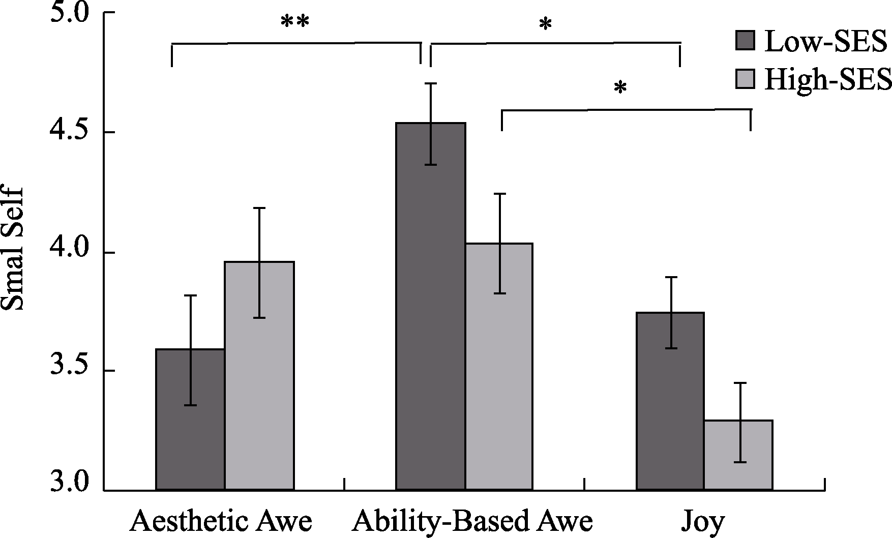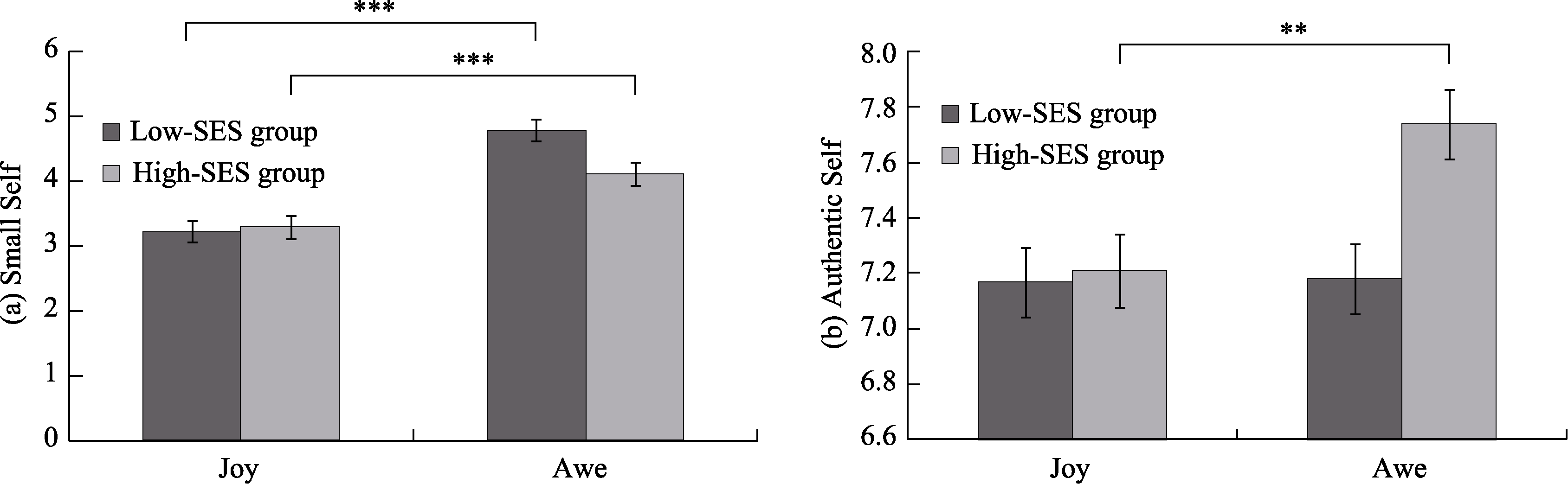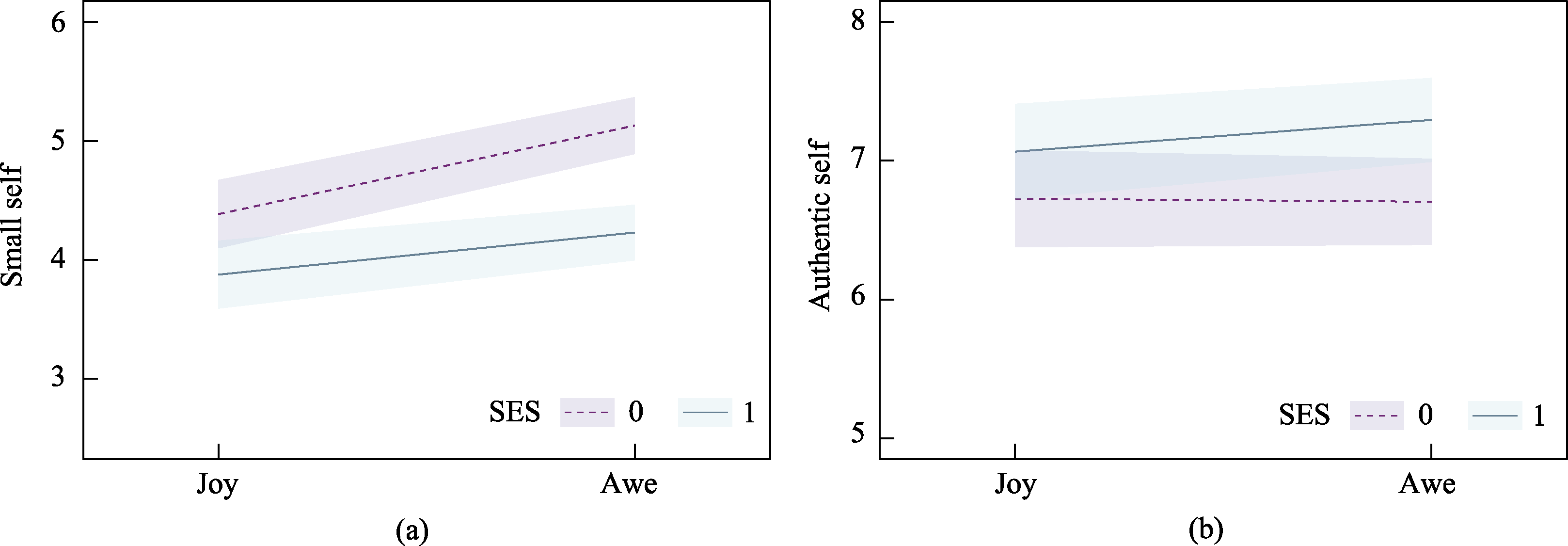 Figure 2. Interaction Effect of Socioeconomic Status and Emotions on the Small Self and Authentic Self Note: SES stands for socioeconomic status, 0 represents low socioeconomic status, and 1 represents high socioeconomic status.