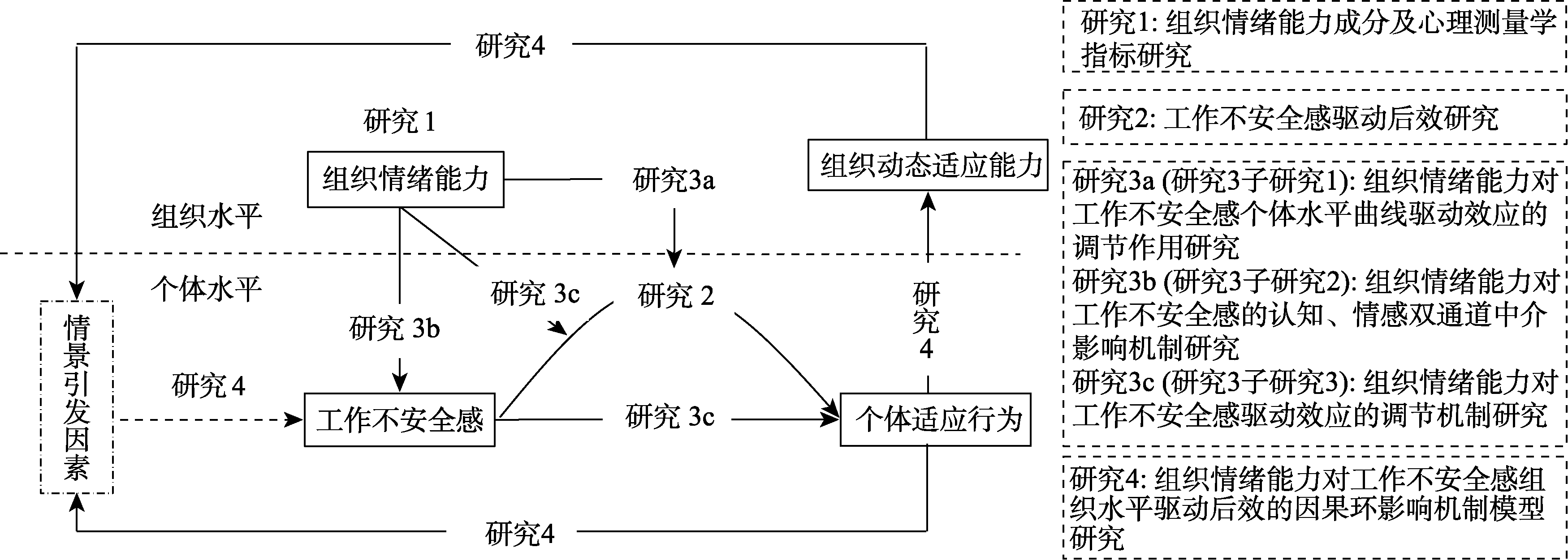 Organizational Emotional Capability (OEC) is a critical yet underdeveloped construct situated at the intersection of strategic management and organizational behavior. Existing research has been constrained by circular reasoning in measurement—inferring OEC components from emotional outcomes—and by insufficient exploration of the mechanisms through which emotions influence organizational functioning. To address these gaps, this study is grounded in organizational dynamic capability theory and focuses on Job Insecurity (JI)—a prevalent emotional response in volatile, uncertain, complex, and ambiguous (VUCA) environments—as the emotional focal point. Work preservation behavior is introduced as the central explanatory mechanism to elucidate how OEC enhances organizational dynamic adaptability by shaping the motivational effects of JI. The research design comprises four interrelated studies, each featuring distinct theoretical and methodological innovations.