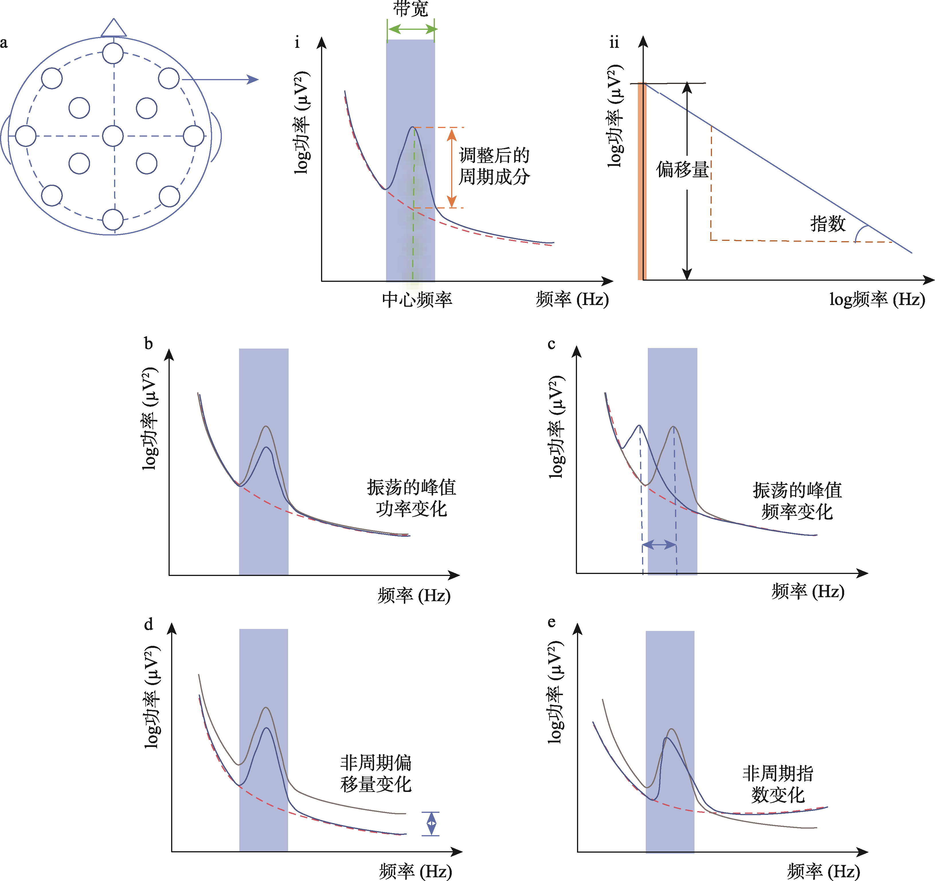 图1 频谱分析中区分非周期与周期性成分的必要性: 非周期分析将某个电极的信号转换为频谱(蓝色实线), 在窄带内(蓝色阴影)提取(a.i)周期性成分(频谱在虚线上方的部分)与非周期性成分(虚线), 其中非周期性成分主要有(a.ii)指数和偏移量两个参数。传统频谱分析判断窄带内频谱能量有无差异时, 以下情况可能会错误认为与(b)振荡功率降低产生类似的总功率变化: (c)周期活动仅改变峰值频率; 仅有非周期活动变化如(d)偏移量或(e)指数的改变。彩图见电子版, 下同。