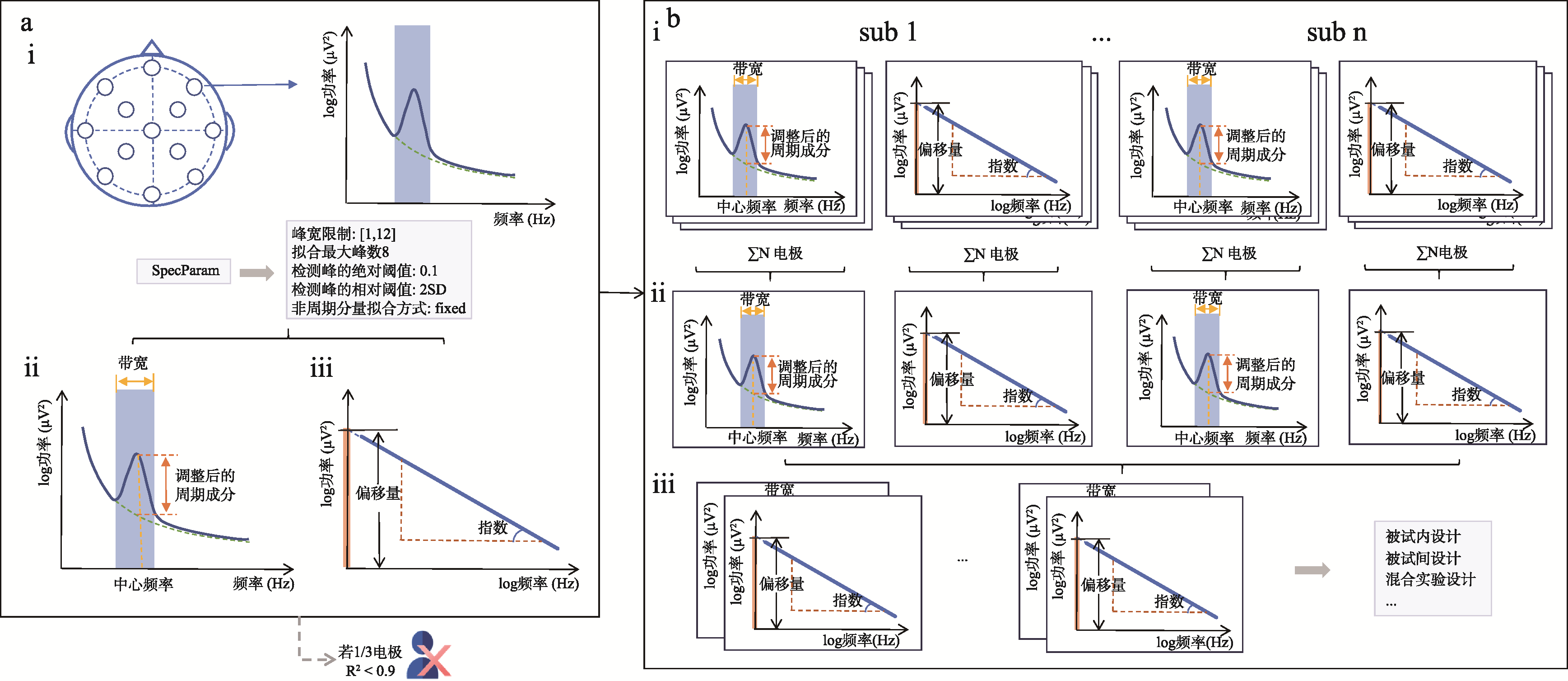 图2 标准化的高密度EEG/MEG非周期/周期分析流程框架。步骤1: (a.i)使用SpecParam工具包进行单个电极水平的估计, 每个电极将得到(a.ii)周期性参数、(a.iii)非周期性参数、拟合优度R2与残差error, 其中周期性参数从每个电极的所有拟合峰中选择最大功率的作为每个电极的代表值。步骤2: 被试水平的评估, 对拟合度达不到要求的电极数过多的被试进行剔除。(b.i-ii)将所有电极的非周期性参数及代表周期性参数取平均值作为该被试的参数化结果。步骤3: (b.iii)组水平的统计。由于每个被试都得到了非周期性成分和周期性成分, 可采用描述性统计或假设检验进行统计。
