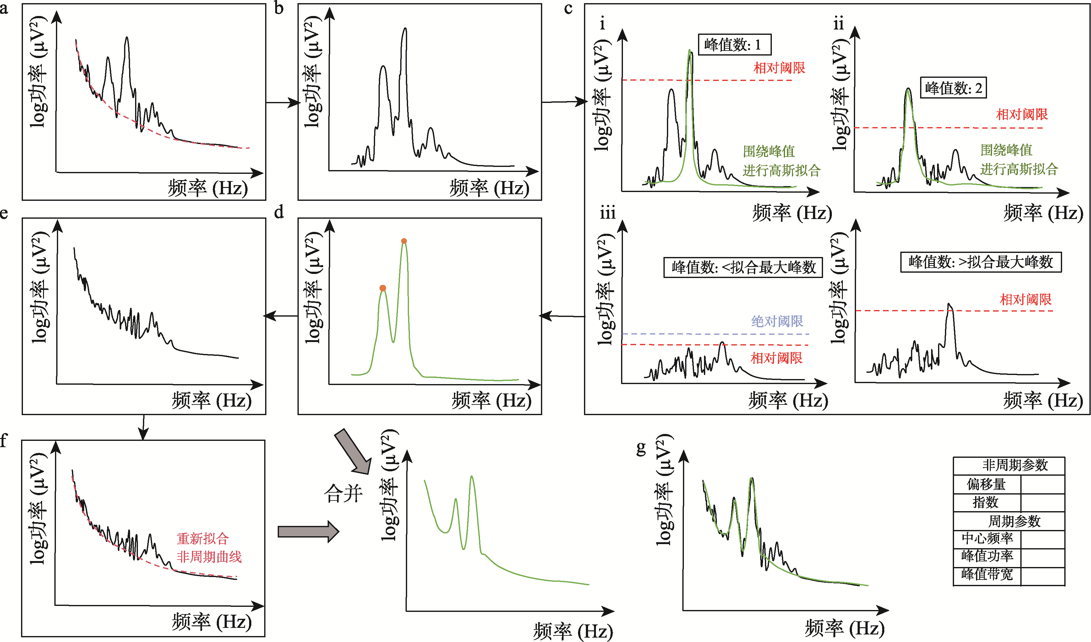 图3 单电极水平上SpecParam的算法步骤: (a)初始非周期拟合: 对原始功率谱密度拟合估计非周期性成分; (b)扁平化频谱: 从原始PSD中减去非周期估计成分, 残差被假设为多个周期性成分和噪声的混合; (c.i)检测峰: 使用迭代过程来查找扁平化频谱中的峰值。找到残差最大值并围绕该峰值拟合高斯曲线, (c.ii)减去拟合的高斯曲线并继续拟合, (c.iii)当下一个识别点低于绝对/相对阈限或拟合峰数超过拟合最大峰值数时迭代停止; (d)创建全峰拟合: 根据高于噪声阈值的峰值数确定振荡的数量后, 对来自(b)的扁平化频谱执行多高斯拟合, 得到所有周期性成分的联合功率(图中橘色圆点标记), 包括每个峰的3个参数: 中心频率、能量和宽度; (e)创建去全峰频谱: 从原始功率谱密度中减去(d)计算的联合功率得到去全峰频谱; (f)重新拟合非周期分量: 在去全峰频谱中重新拟合非周期性成分, 得到指数和偏移量;将(d)联合功率与(f)非周期性成分的重新拟合相结合获得最终拟合(g)。