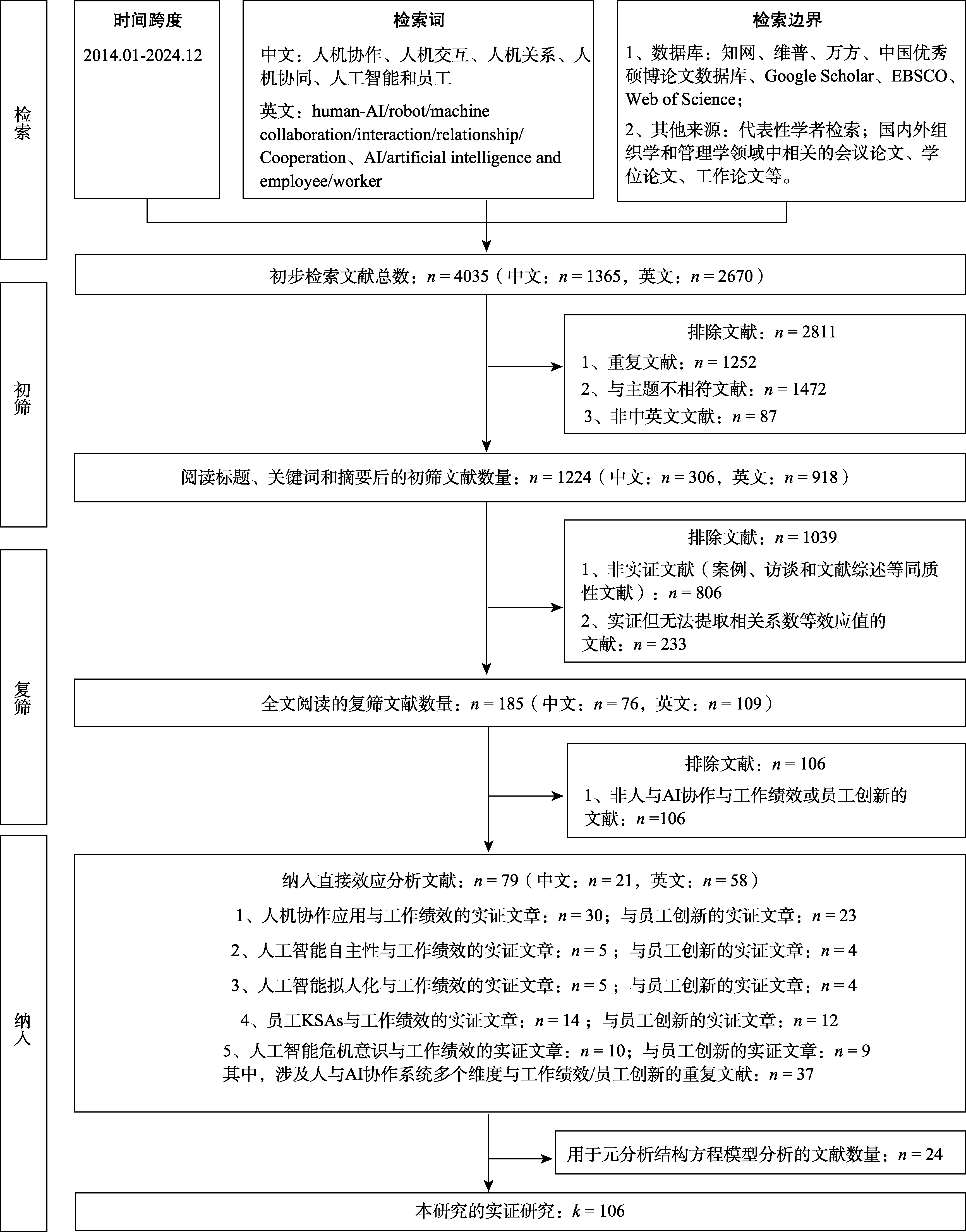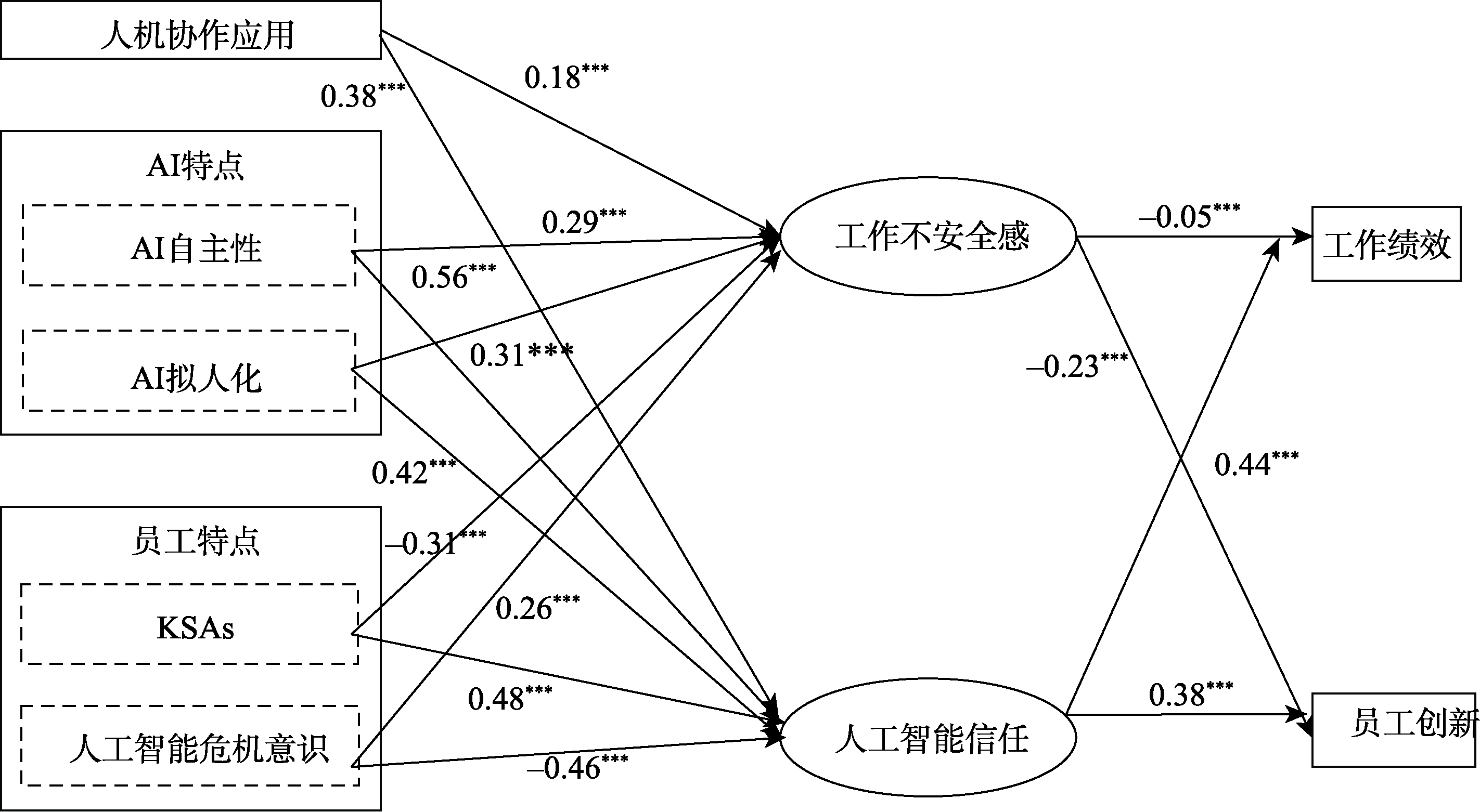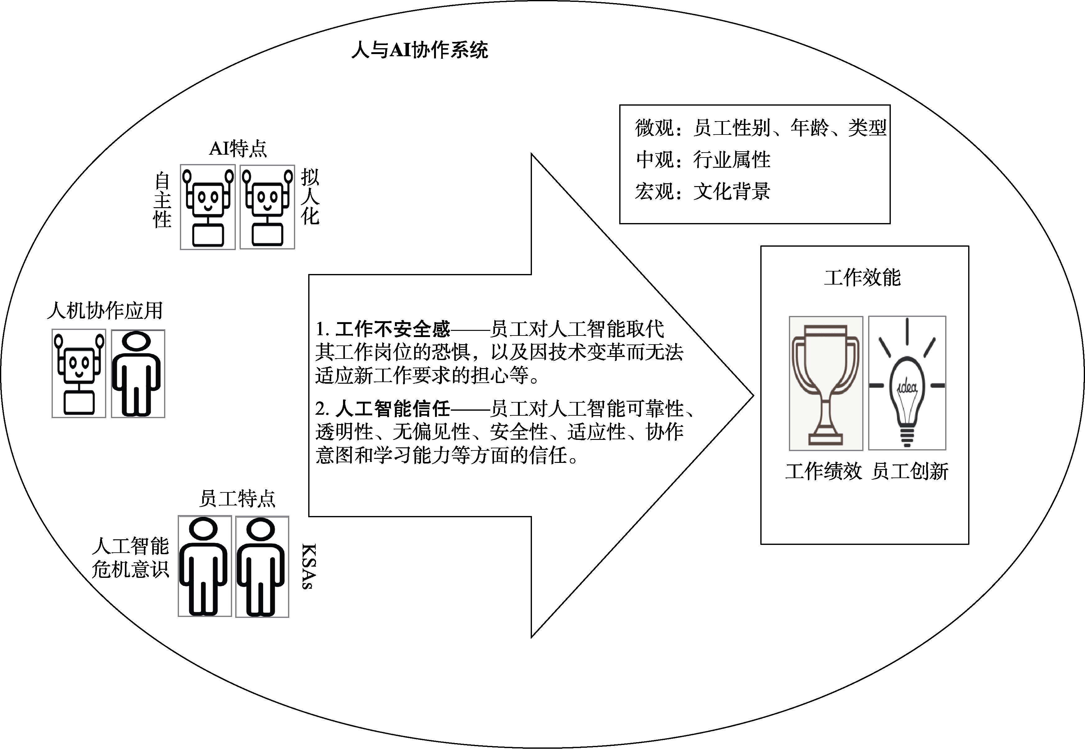 人工智能的快速发展深刻改变了社会结构和生产模式, 其在组织中的应用对员工工作效能的影响获得了学者们的密切关注。为探讨人与AI协作系统对员工工作效能的影响及其机制, 本研究对79篇国内外文献的106个独立样本(n = 54726)进行了元分析。研究发现:人机协作应用、AI自主性、AI拟人化及员工KSAs (知识、技能和能力)对员工工作效能有正向影响, 表现为“机会”; 而人工智能危机意识则产生负向影响, 被视为“威胁”。人工智能信任和工作不安全感在人与AI协作系统和员工工作效能的关系中发挥中介作用, 进一步阐释了“机会”与“威胁”双路径。并且, 员工类别、行业属性和文化背景具有一定的调节作用。研究结论表明人与AI协作系统具有双刃剑效应, 既可以通过人工智能信任提升员工工作效能, 也能够通过工作不安全感降低员工工作效能, 且积极效应强于消极效应。本研究在资源保存理论的框架下, 明晰了人与AI协作系统对员工工作效能的影响机制及其边界条件, 为组织正确看待人与AI协作系统带来的影响, 有效发挥AI价值提供指导。