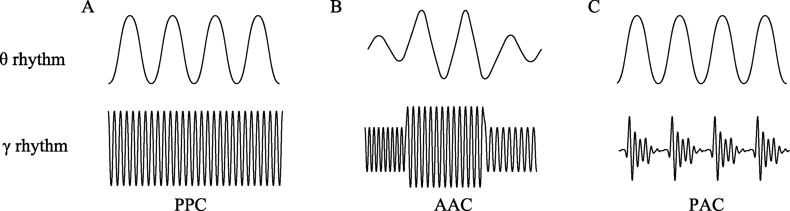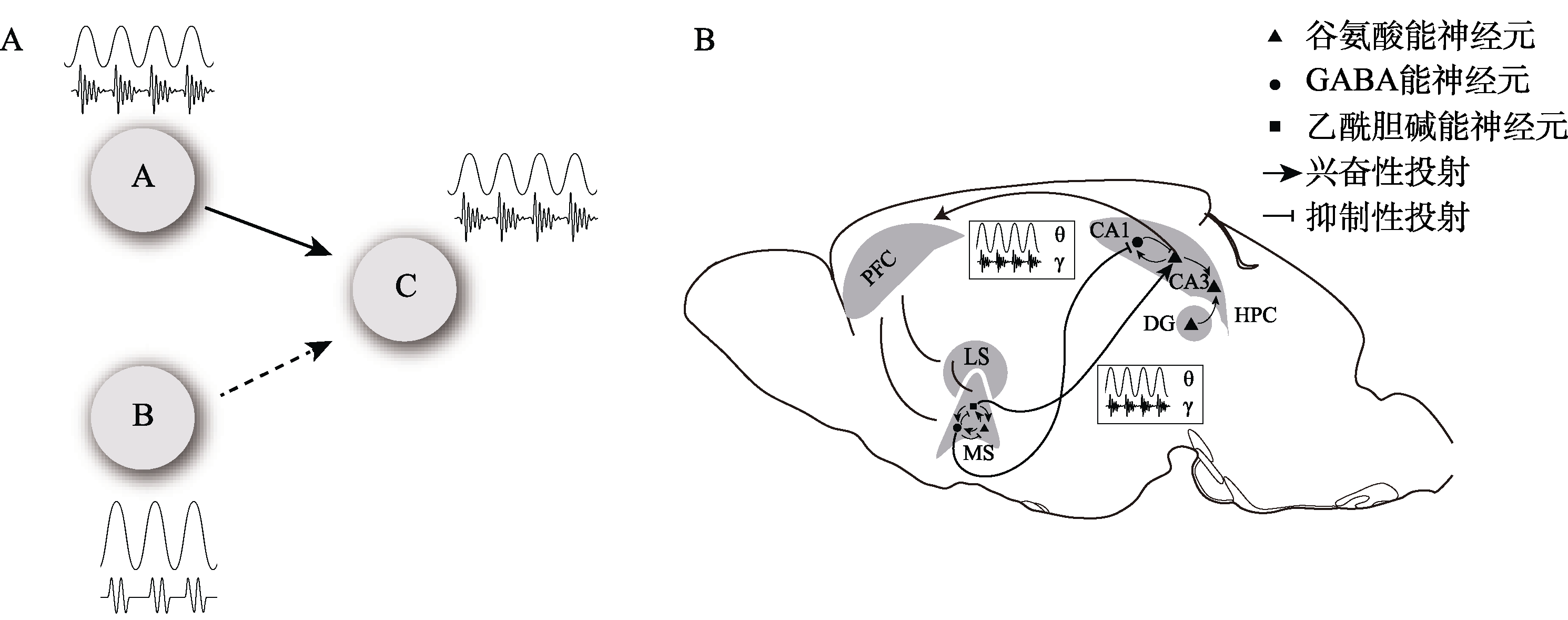 图3 低频振荡(如theta振荡)相位和gamma功率之间的耦合可以促进跨区域之间信息的同频协调。(A)脑区A和C中的神经元进行通信时, 它们通过低频(如theta振荡)波段进行连贯的同频振荡, 通常gamma振荡嵌套在theta振荡中, 即TG-PAC。因此脑区A中的gamma活动将能够传递到C区中的神经元, A和C中的gamma振荡将保持同频。在脑区B则作为脑区C低频振荡的外部重要驱动源, 间接影响脑区A和脑区C之间的TG-PAC。(B)图中三角形、圆形和正方形分别代表谷氨酸能神经元、GABA能神经元和胆碱能神经元, 图中显示了前额叶、内侧隔核和海马三者之间的神经联系, 其中内侧隔核内部三种神经元局部相互连接, 形成密集的局部网络, 内侧隔核的GABA能神经元和谷氨酸能神经元主要终止于海马CA1区的GABA能神经元; 海马CA1的谷氨酸能神经元投射至前额叶区域; 前额叶则与内侧隔核和外侧隔核均有突触联系。前额叶与海马、内侧隔核与海马之间存在的theta-gamma相位幅值耦合也以波形的方式在三个脑区之间标出。