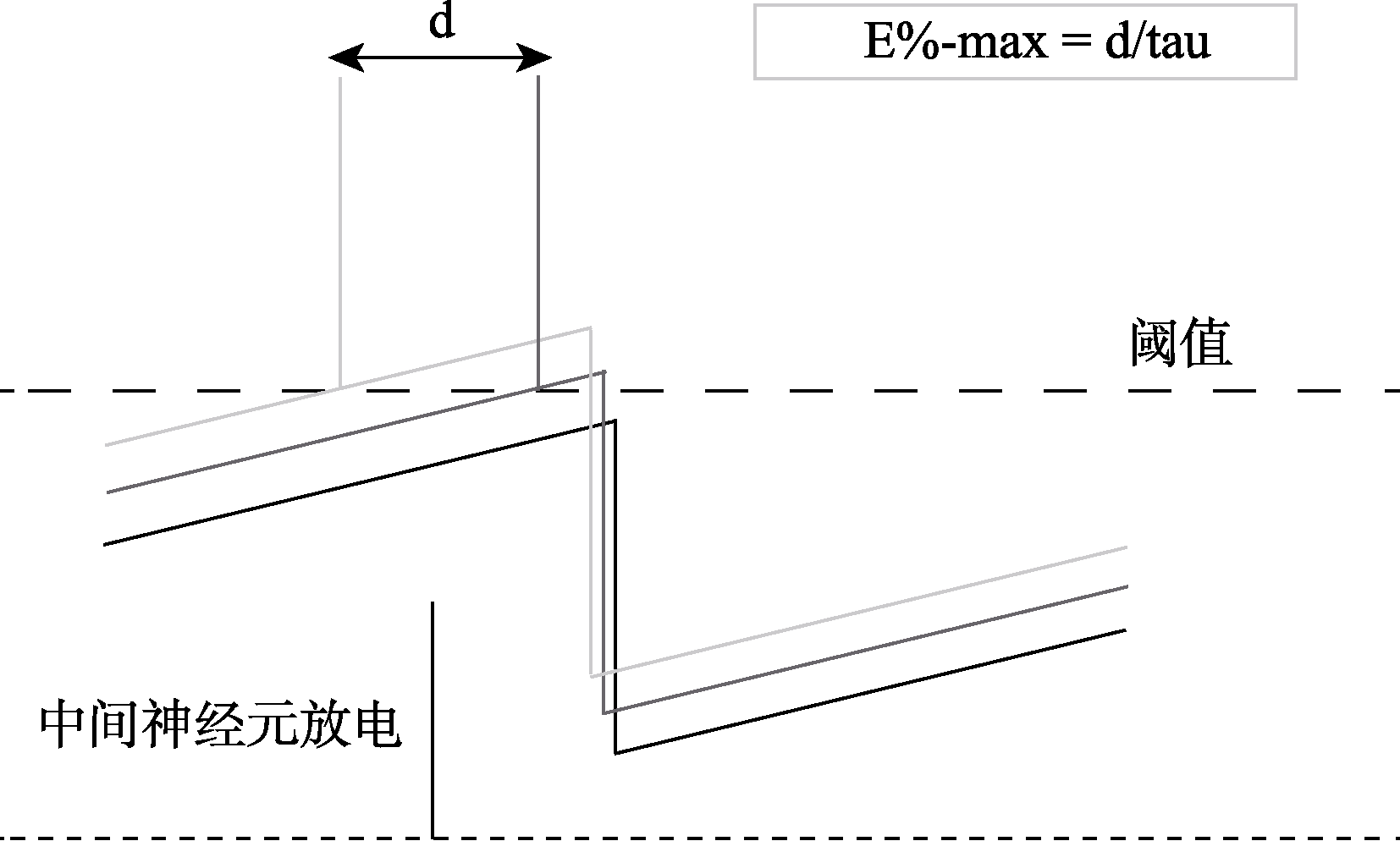 图2 gamma振荡周期中的全局性抑制如何决定哪些神经元放电。图片中三种不同灰度的直线分别代表了一个gamma周期内兴奋性由强到弱的三种神经元, 浅灰代表最兴奋的神经元, 中灰代表中等兴奋的神经元, 黑色的则代表低等兴奋神经元。在一个gamma周期中, 伴随着中间神经元对周围神经元抑制的衰减(由抑制性突触后电位 的时间常数tau决定), 最兴奋的神经元最先放电, 一旦某个神经元放电, 它会通过快速抑制性中间神经元触发全局反馈抑制, 阻止其他神经元继续放电, 然而, 由于反馈抑制的传递存在延迟(d), 在这个延迟期窗口内, 兴奋性略低于最兴奋神经元的其他神经元(中等强度的神经元)也有机会放电。