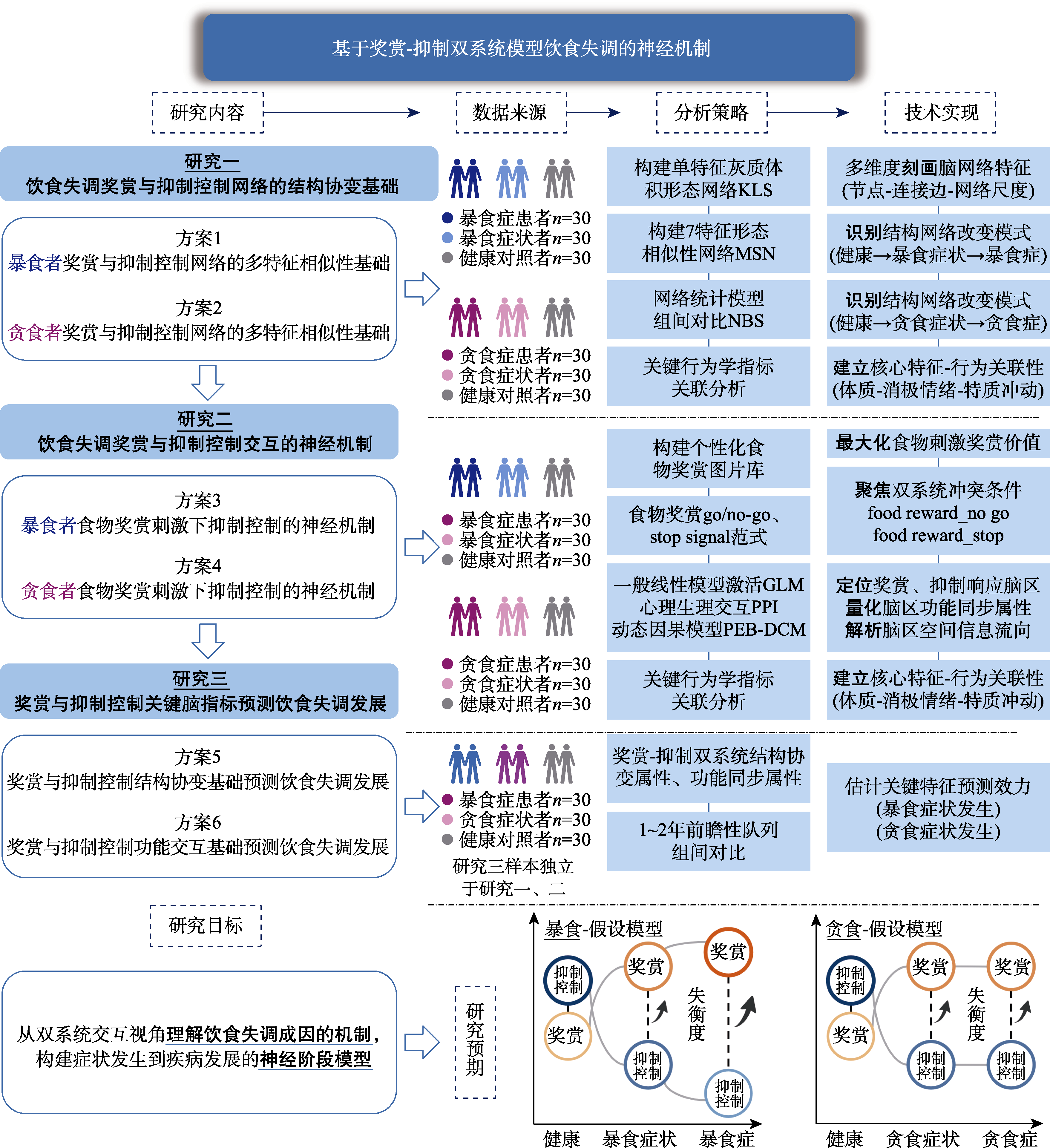 近30年来我国饮食失调群体数量陡增, 增长率居世界前列, 成为全球因饮食失调死亡人数最高的国家。经济快速发展、社媒广泛传播以及干预效果欠佳共同加剧了中国的饮食失调问题。如何控制饮食失调的发生成为严峻而现实的问题。本研究拟以大脑奖赏系统和抑制控制系统的交互作用为突破口, 基于“结构特征刻画−加工机制解析−预测因子锚定”的递进式研究框架, 开展三个研究。首先, 使用新颖的多特征形态相似性网络分析技术, 探究暴食样饮食失调奖赏与抑制控制网络的结构协变基础; 其次, 采用新编食物奖赏反应抑制双范式, 考察食物奖赏线索对暴食样饮食失调者抑制控制的影响机制; 最后, 采用前瞻性队列设计, 探查能有效预测暴食样饮食失调发生的关键神经指标。本研究力图探明暴食样饮食失调从健康到不健康的动态范围, 并构建症状发生到疾病发展的神经阶段模型, 为饮食失调的精准识别、早期预防及干预治疗提供科学依据, 具有现实性、前沿性和前瞻性。