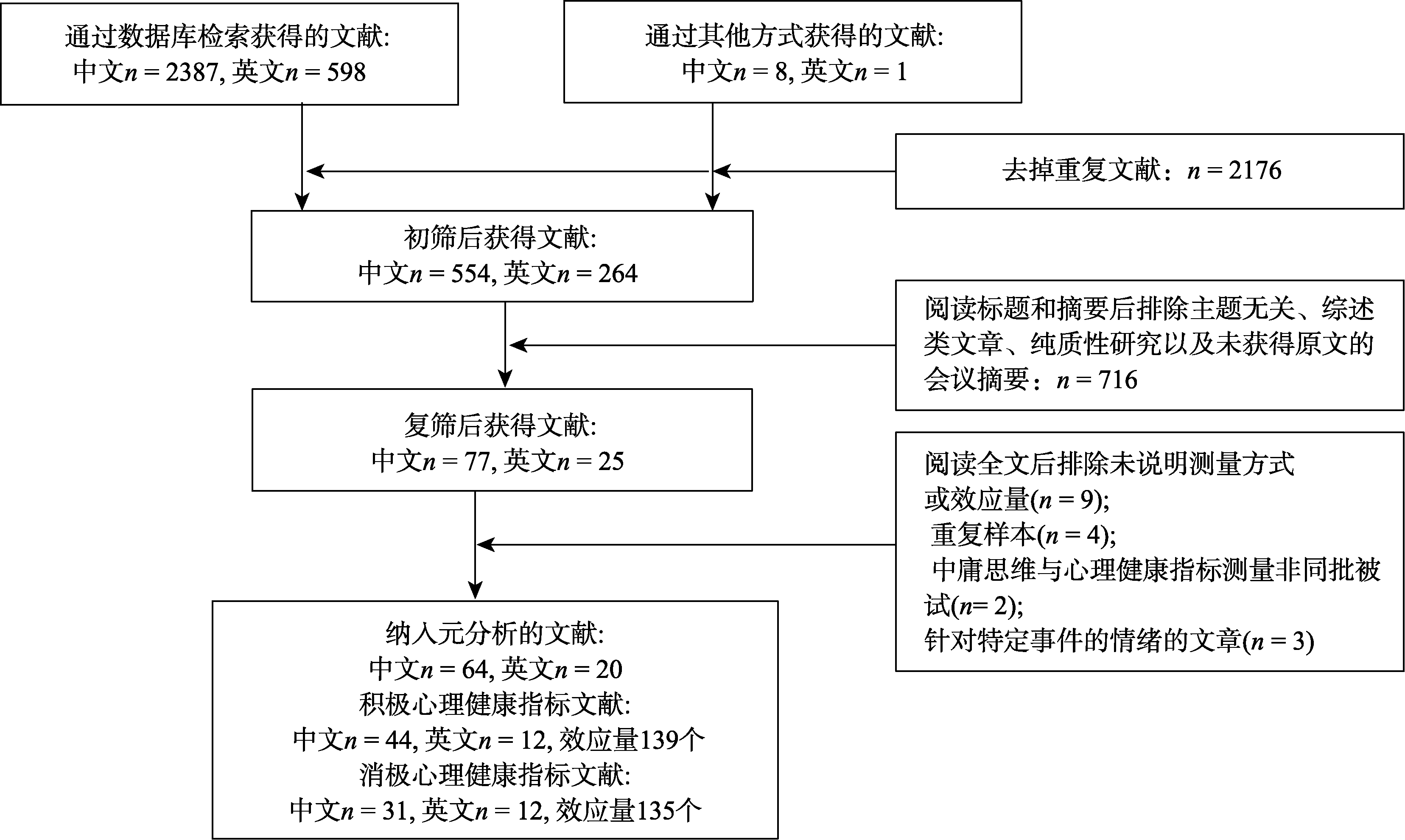 基于中庸实践思维体系和心理健康双因素模型, 运用三水平元分析方法探讨中庸思维与心理健康的关系及其调节因素。检索2025年4月30日之前的文献, 最终纳入56篇探讨中庸思维与积极心理健康关系的文献, 共60个独立样本, 139个效应量, 35410名被试, 以及43篇探讨中庸思维与消极心理健康关系的文献, 共45个独立样本, 136个效应量, 35596名被试。结果发现, 中庸思维与积极心理健康指标显著正相关(r = 0.24), 与消极心理健康指标显著负相关(r = −0.21), 二者均为中等水平效应量; 中庸思维与心理弹性、工作满意度、工作幸福感的相关高于其与生活满意度的相关; 中庸思维和幸福感、安适感、积极情绪的相关与其和生活满意度的相关无显著差异。使用中庸信念−价值量表、中庸意见表达量表以及中庸价值取向量表测得的效应量彼此差异较小, 且与中庸实践自评量表测得的效应量差异显著。结合元分析的结果, 对中庸思维的理论内涵、测量方式, 及其与心理健康的关系进行了讨论, 指出从超越二元对立的“执中致和”视角理解中庸思维与心理健康所具有的理论建构意义。