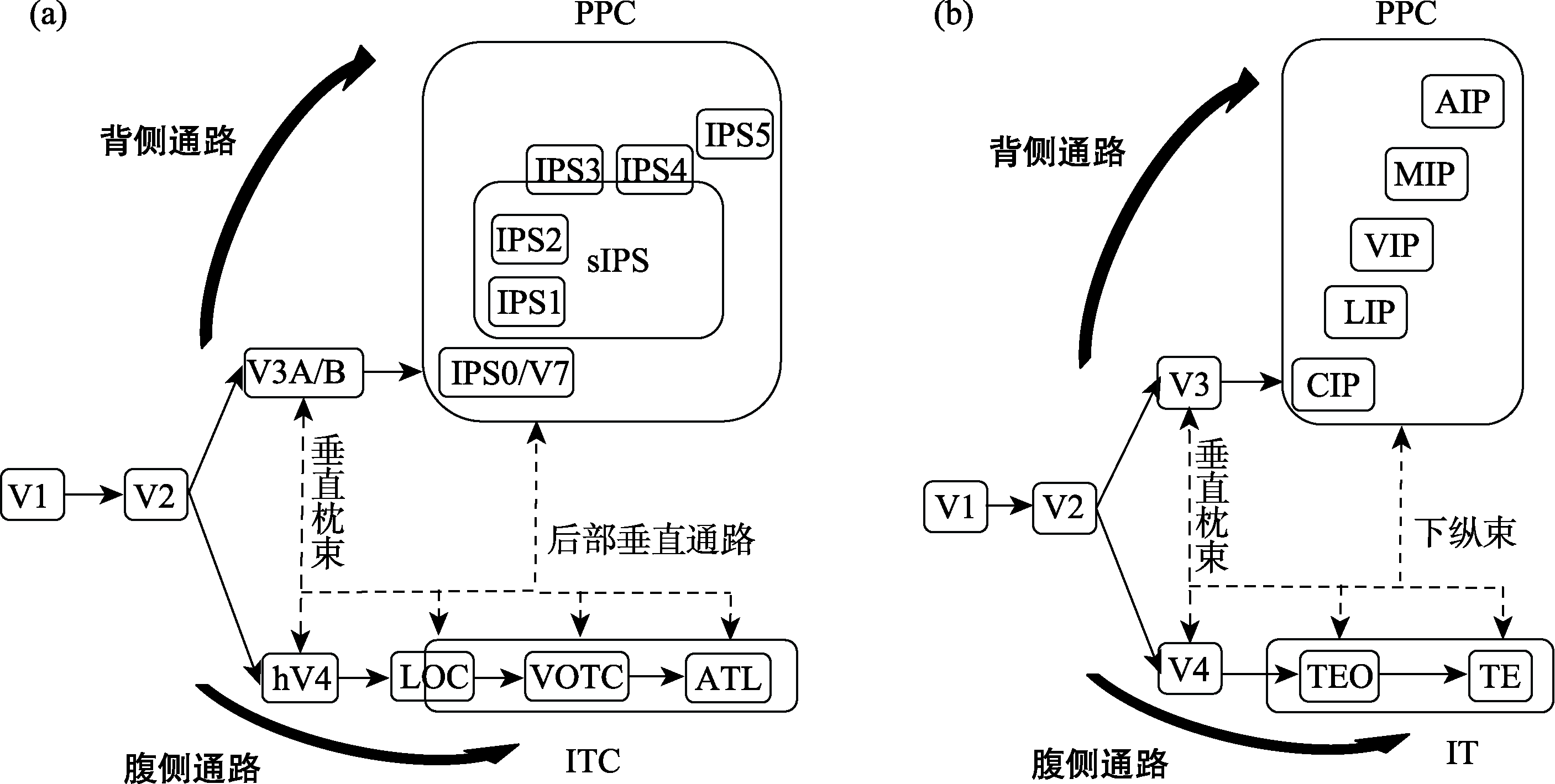 大脑的视觉系统通过背侧与腹侧通路加工物体的视觉信息。腹侧通路主要负责“是什么” (what)的物体视觉识别加工, 背侧通路主要负责“在哪里” (where)的物体视空间与运动加工。但是, 背-腹通路存在多重交互的神经连接, 提示视觉物体表征加工中存在两者的功能相互作用。一方面, 腹侧通路并不能单独计算物体的整体形状, 背侧通路对物体整体形状的表征信息有必要与腹侧通路表征的物体局部特征信息汇合, 以支持不变性的物体视觉信息加工; 另一方面, 在目标导向的思想和行为中, 背侧通路需要实时提取和保持来自腹侧通路的物体视觉信息, 以实现适应性的物体视觉信息加工。前者是一种主要受特征驱动(自下而上)的功能整合, 而后者是一种主要受任务驱动(自上而下)的功能整合。未来还需深入研究注意对背侧通路表征物体整体形状的影响、物体熟悉性调节整体形状与局部特征整合的机制、视觉工作记忆如何抵抗干扰以保持对目标导向刺激的加工机制、内生记忆信息对适应性视觉物体表征的影响, 以及背-腹通路的发育机制及其对两者相互作用的影响等。