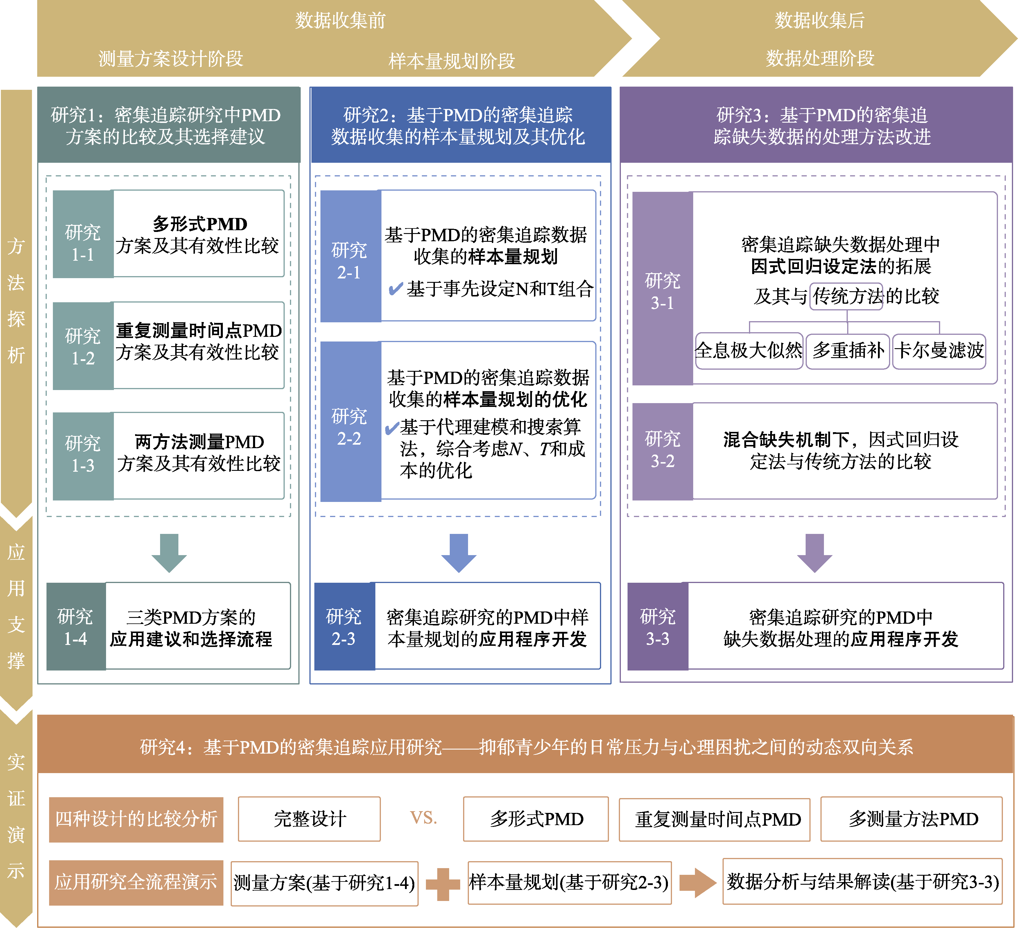 Inspired by the idea of planned missing design (PMD) in cross-sectional studies, this research aims to explore effective ways to improve data quality and study efficiency by optimizing data collection plans and improving the method of missing data handling in intensive longitudinal studies. Focusing on ILSs with PMDs, this research will conduct three methodological studies and one applied study within the framework of dynamic structural equation modeling (DSEM). In Study 1, we will first design multiple schemes for types of PMDs and then conduct Monte Carlo simulation studies to compare the performance of different schemes under various conditions. Finally, we will offer practical advice on better selecting and applying PMDs in ILSs. In Study 2, we will first present a standard procedure to recommend the sample size for PMDs. Then, we will highlight a surrogate modeling framework based on machine learning predictions to optimize sample size planning. Finally, we will develop a user-friendly and accessible application for power analysis and sample size calculation. In Study 3, we will first propose a new method for handling missing data by combining factored regression specification with Bayesian estimation. Then, we will conduct Monte Carlo simulation studies to compare the performance of the proposed method with three existing methods under different missingness mechanisms. Finally, we will develop a software package and offer practical recommendations on selecting missing data handling methods. In Study 4, we will conduct an empirical study to demonstrate how to develop appropriate measurement protocols under each type of PMD, how to determine the sample size for different missing pattern data using the optimization application, and how to appropriately handle missing data, perform data analyses, and interpret the results.