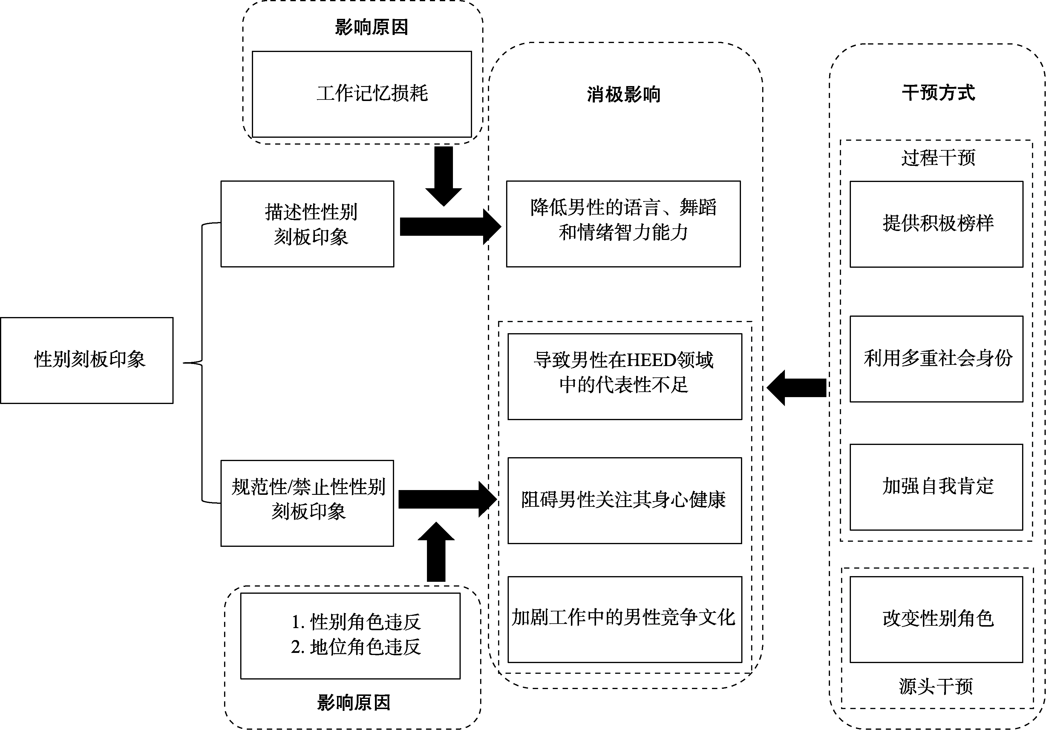 Interventions aims at mitigating the negative effects of both descriptive and prescriptive/proscriptive gender stereotypes on men can be conceptualized from two complementary perspectives: underlying processes and root causes. From the perspective of underlying processes, several theoretical frameworks offer guidance. Drawing on social comparison theory and the influence hypothesis, exposure to positive male role models can help counteract stereotype-based expectations. Based on social identity theory and the multiple identities hypothesis, emphasizing men’s multiple social identities may buffer against the negative effects of gender stereotypes. Similarly, self-affirmation theory suggests that fostering self-affirmation in men can reduce the psychological burden of stereotyped-based threats. From the perspective of root causes, social role theory highlights the importance of altering traditional gender roles to reduce the structural foundations of gender stereotypes. Interventions that promote greater flexibility and diversity in men’s social and occupational roles may therefore serve as a long-term strategy for stereotype reduction.