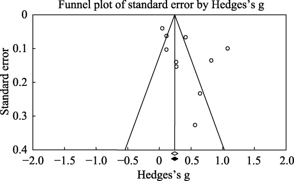 | 图2 针对所有学生的态度干预效果漏斗图; 剪补研究 = 0 |