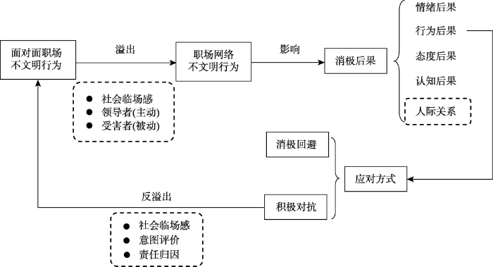 在办公电子化的现代组织中, 网络约束较为松散, 不文明行为通过邮件等网络通讯工具表现出来, 其传播速度更快且影响范围更广。工作环境的多样化、网络的普及和新技术的使用让原本已形势严峻的不文明行为外溢到虚拟工作领域, 给组织及个体带来了诸多困扰。尽管网络不文明行为仅在近几年来才得到研究关注(Lim & Teo, 2009; Giumetti & Hatfield, 2013; Giumetti et al., 2016), 但其所反映的另一种演变模式早已潜伏在工作环境的特点之中。不文明行为从现实领域向虚拟领域的溢出为研究者提供了全新的视角, 对于这一特殊的溢出现象, 不少研究者已预见了这一发展趋势并呼吁相关研究予以考察。例如, Wright等人(2014)指出, 信息交流技术的出现导致职场发生了翻天覆地的变化, 尽管这为组织和员工提供了削减成本和更便捷的完成工作任务等好处, 但也会带来压力、倦怠和高离职意图等消极影响。鉴于此, 研究者开始探讨职场网络不文明行为的特殊消极效应, 并认为面对面不文明行为正在因为虚拟工作情境的发展而外溢到在线工作活动中(Giumetti et al., 2012)。