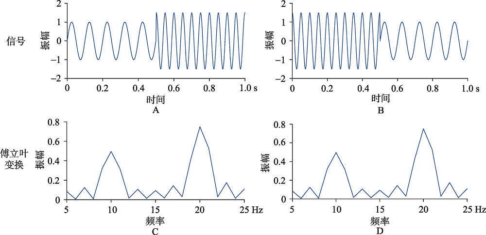 | 图2 时变信号的傅立叶变换示意图。A、B为信号示意图, 其中A为前半段为振幅为1的10 Hz正弦振荡, 后半段为振幅为1.5的20 Hz余弦振荡; B为前半段为振幅为1.5的20 Hz余弦振荡, 后半段为振幅为1的10 Hz正弦振荡。C、D分别为A、B信号的傅立叶变换结果。 |