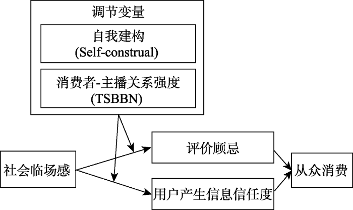 如前所述社会临场感描述的是他人在互动中的显著性程度以及随之而来的人际关系显著程度, 因而消费者怎样看待自我以及怎样看待与他人的关系可能起着调节社会临场感对线上从众消费的作用。因此, 本研究选取自我建构与消费者-主播关系强度作为调节变量, 从自我意识和对人际关系的意识角度研究自我建构及消费者-主播关系强度在社会临场感影响线上从众消费的认知过程中的调节作用以寻找直播营销情境下消费从众的边界条件(图4)。