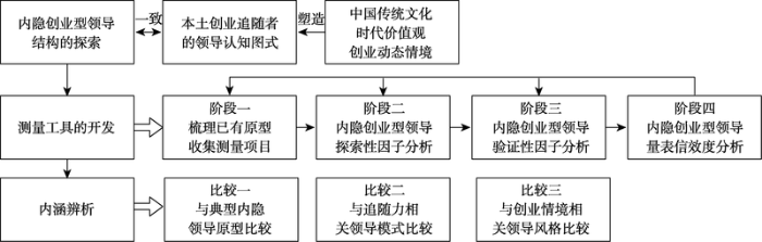 内隐创业型领导是一种新的领导方式, 揭示内隐创业型领导的结构并检验独特性是首先需要解决的问题, 也是整个研究的理论起点。本研究采用归纳法揭示内隐领导型领导的结构, 依照组织行为学惯用的量表开发程序, 构建内隐创业型领导的测量工具; 并通过与其他领导风格的比较, 深层次验证内隐创新型领导的独特性。该部分研究框架如图2所示。