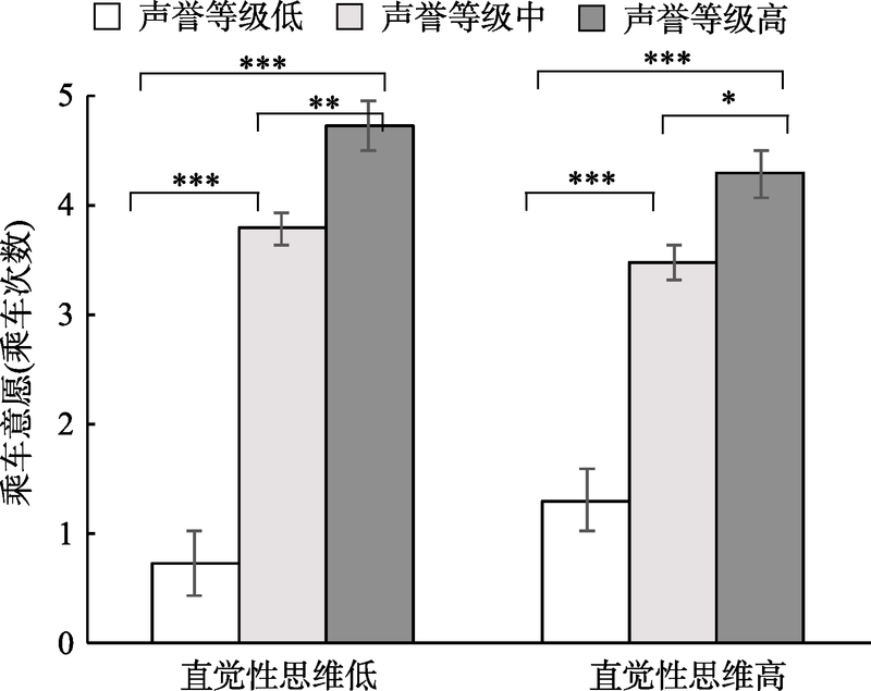 | 图2 直觉性思维对声誉效应的调节作用 注:*p < 0.05; **p < 0.01; ***p < 0.001 |