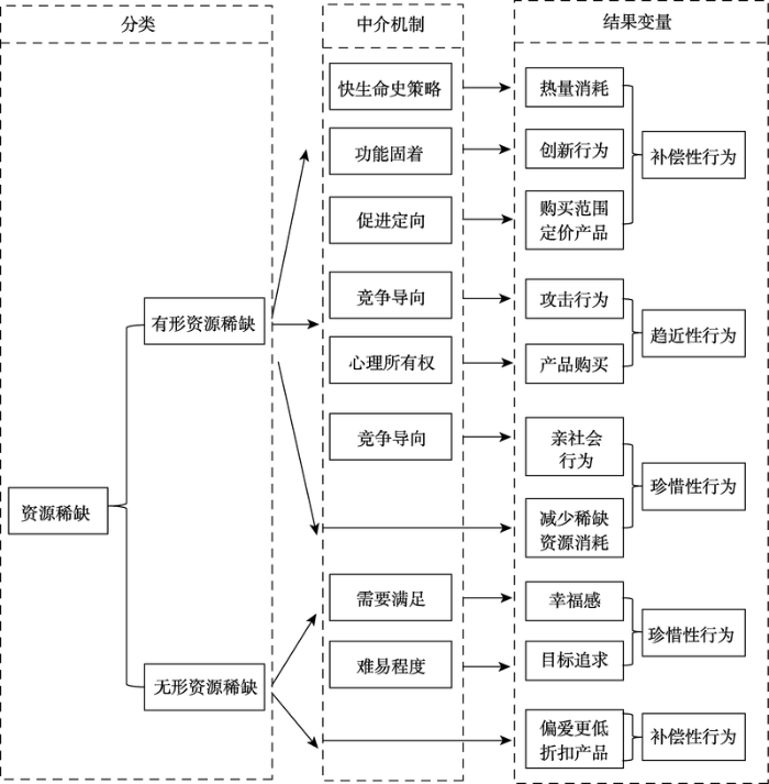 稀缺是由资源的真实缺乏或感知缺乏所引起的个体欲望和需求得不到满足的一种状态。稀缺作为一种普遍存在的现象对个体的情感、认知、以及行为方式产生了重要的影响, 但是不同类型的稀缺(以食物、产品、资金为代表的有形资源稀缺vs.以时间为代表的无形资源稀缺)对个体心理和行为的影响是否存在共性与差异?梳理文献发现, 有形资源稀缺会使个体产生珍惜性行为、补偿性行为和趋近性行为, 而无形资源稀缺只会使个体产生珍惜性和补偿性行为。未来研究应关注稀缺影响个体行为的边界条件, 以及时间稀缺对个体心理和行为的影响。