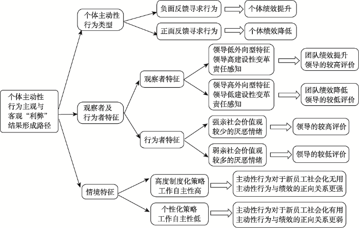 整合机制三: 从组织情境因素来看, 个体主动性行为的利弊结果还与个体所处组织情境特征的两面性有关。这些组织情境因素主要涉及工作和团队自主性、公平或创新氛围、阻碍性或挑战性压力源、感知到的组织支持等(Parker et al., 2019)。例如, 当工作自主性高时, 主动性行为(如反馈寻求行为等)与绩效结果的正向关系更强, 因为此情境为个体提供了利用主动性行为获得信息的自由; 反之, 当工作自主性低时, 主动性行为与绩效结果的正向关系更弱(Kim, et al., 2009)。在高度制度化策略(institutionalized tactics)的情境中, 新员工的主动性行为显得没那么必要, 因制度化策略已为员工提供了可遵循的详细工作流程, 所以其主动性行为对其社会化无帮助; 在采取个性化策略(individualized tactics)的情境中, 角色界定和工作期望要求不太清晰, 新员工需要通过主动性行为来降低不确定性。所以, 个体主动性行为利弊结果背后机制与组织情境特征有关。