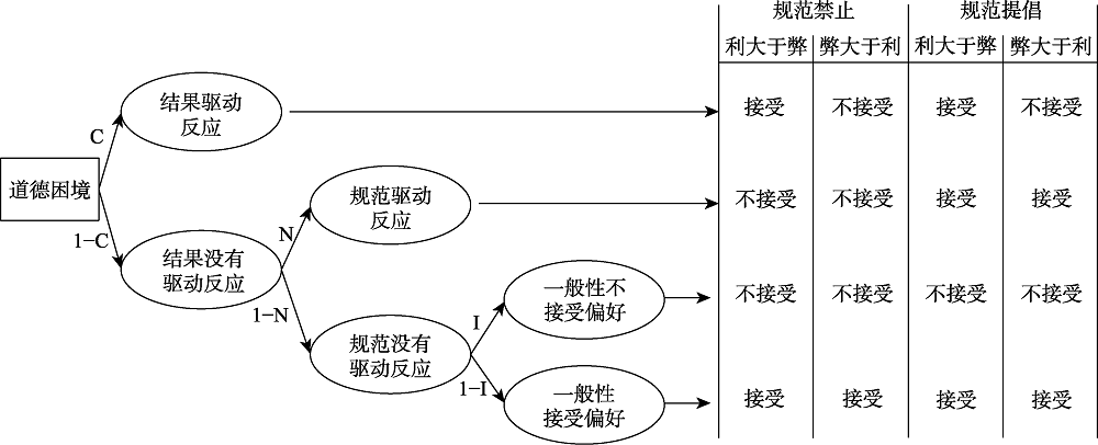 | 图2 CNI模型的多项式决策加工树图解, 其中C代表结果敏感性, N代表规范敏感性, I代表一般性不接受偏好(Gawronski等认为一般性接受偏好的反应概率与一般性不接受偏好的反应概率之和为1, 因此在模型中仅用一个I参数即可表达)。 资料来源:Gawronski et al. ( |