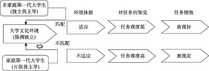 一般来说, 来自不同社会背景的大学生在自我模式上存在显著差异。通过家庭、社区和学校等社会情境, 不同社会阶层背景的学生发展出与自身阶层相适应的自我模式, 这种受社会阶层文化影响发展出的自我模式与其本身所处的社会阶层情景相适应。虽然高、低社会阶层文化塑造的自我模式存在差异, 但这些差异均对处于不同社会阶层情境下的学生具有适应性意义(邓子谦 等, 2020)。在以往文献中, 研究者倾向于认为家庭第一代大学生属于低社会阶层背景的学生, 其自我模式以“互依我”为主; 而非家庭第一代大学生属于高社会阶层背景的学生, 其自我模式以“独立我”为主(Markus & Kitayama, 2010)。然而, 在高等教育中, 大学往往优先考虑以“独立”为代表的个人主义取向的文化规范, 重视学生自我的表达和独立性的实现。如调查发现, 高校的管理人员普遍认为自己所在大学的文化是鼓励独立的, 并认为高等教育更应当注重培养学生独立思考、解决问题以及表达自己观点、影响他人的能力。对大学生群体的研究也发现, 他们在新环境中从事社会化活动时, 也常常会感到大学是以“独立”为标准来组织这些活动的(Stephens, Fryberg, et al., 2012)。很显然, 这种大学的文化规范更符合非家庭第一代大学生群体中的独立型文化, 而忽略了在家庭第一代大学生群体中对互依型文化特征的需求(Carey & Markus, 2017)。