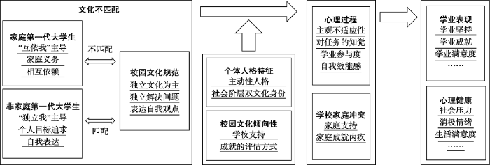 Two models (normative well-being model and critical cultural wealth model) were introduced to better understand the effect of cultural mismatch on first-generation college students. By combining these models, we broaden and develop a more comprehensive framework from which to understand first-generation college students’ campus experiences. The framework presented here describes students’ academic performance and psychological well-being using the following four dimensions: individual personality traits, campus cultural tendencies, psychological processes and school-family conflict. These dimensions are collectively may be used as a framework to capture the academic difficulties, self-cognition, and social pressure.