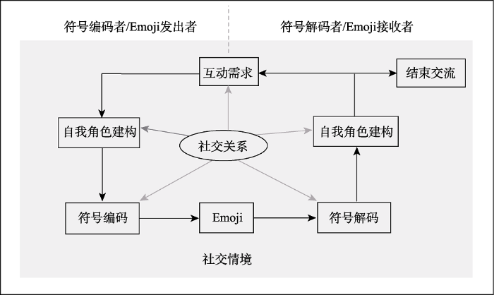 根据符号互动理论, 符号互动离不开四个主要因素, 即社会关系、个体、情境和符号(Blumer, 1969)。其中的个体包括交流双方的符号编码者和符号解码者, 即符号发送者和符号接收者。而符号的意义来源于个体在某一社会情境中的互动交流。那么通过符号互动理论可以将Emoji在网络交流中的互动机制演示为以下几个步骤(见图1):(1)基于某种社交关系的个体之间, 在某种动机的驱动下产生了互动需求; (2)在考虑到这种社交关系和当前的社交情境下, 符号编码者会提前设想自己应该展现出一个怎样的形象, 于是在进行对话前会进行自我的角色建构; (3)明确自己在当前对话中的角色以后, 符号编码者会根据自己的角色和对话情境选择合适的Emoji来传递信息和表达情感; (4)符号解码者在接收到信息后, 同样会根据双方的关系进行自我角色建构, 并在考虑当前的社交情境下对符号编码者发出的Emoji进行解读; (5)最后, 符号解码者要么回复以结束互动, 要么再根据自己的互动需求以符号编码者的身份与对方继续进行互动。在这整个互动的过程中, Emoji就成为了交流者之间互动的媒介, 并且因为Emoji本身的视觉特性, 如形象、具体、直观和生动等特性, 能够给交流双方带来视觉上的冲击, 以及更广阔的想象空间, 于是相比单纯的文本语言符号就更容易使对话交流充满趣味性。并且符号编码者和解码者的身份会在交流者之间不断地进行转换, 并随着交流情境的不断改变和双方关系的微妙变化, 双方交流中所使用的Emoji也会更容易成为属于双方共有的、具有一定意义的传达信息和情感的中介符号。