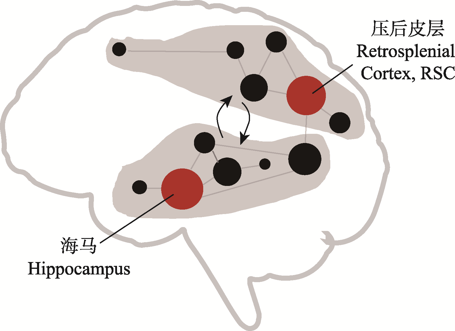 空间导航的脑网络模型示意图(灰色区块为可能存在的功能模块, 红色圆点为可能的核心节点脑区, 灰色箭头为不同功能模块间动态交互)