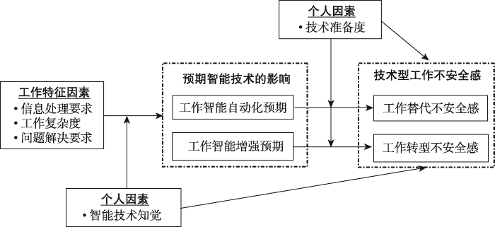 人工智能技术的发展和应用几乎会对所有工作产生影响, 然而影响程度和影响模式存在差异。人工智能技术通常自动化迭代和信息处理类任务, 协助人类完成复杂的问题解决类任务(Daugherty & Wilson, 2018)。因此, 当前工作的工作特征很大程度上决定了人工智能技术将对工作产生何种影响。另外, 员工能否意识到人工智能技术对工作的影响以及如何评价这一影响也可能导致其体验到不同程度的技术型工作不安全感(Brougham & Haar, 2020; Lingmont & Alexiou, 2020)。本研究拟从工作特征因素和员工个人因素两方面探讨技术型工作不安全感的来源。研究的核心问题: 员工当前工作的工作特征会影响其感知到的技术型工作不安全感吗?影响机制是什么?哪些特征的员工更倾向于感知到技术型工作不安全感?工作特征与个人特征会联合影响员工感知到的技术型工作不安全感吗?