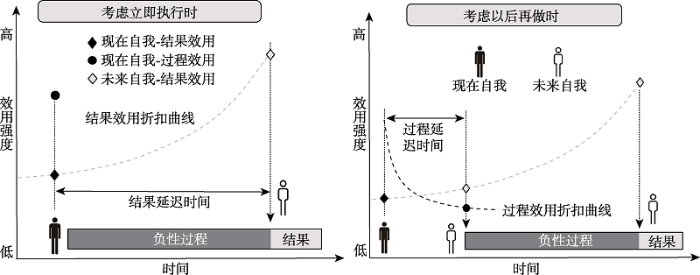 情绪调节观点(emotion-regulation perspective)和时间动机理论(the temporal motivation theory)是能够较好解释拖延行为的早期理论。情绪调节观点认为拖延是一种应对任务厌恶的消极策略(Sirois & Pychyl, 2013)。这种消极策略的表现为: 明知不利于长远目标, 仍推迟任务以暂时性地回避执行任务的负性情绪。另一方面, 时间动机理论认为延迟折扣效应(delay discounting effect)使人们对任务远期结果的考虑不足, 从而选择了拖延(Steel & König, 2006)。根据延迟折扣效应, 远期结果对任务的促进作用会随着其延迟时间的增加以双曲线的形式折扣。因此, 个体只有在足够临近截止日期时才会充分地意识到远期结果的价值, 选择执行任务。