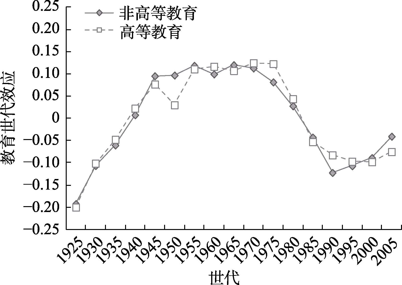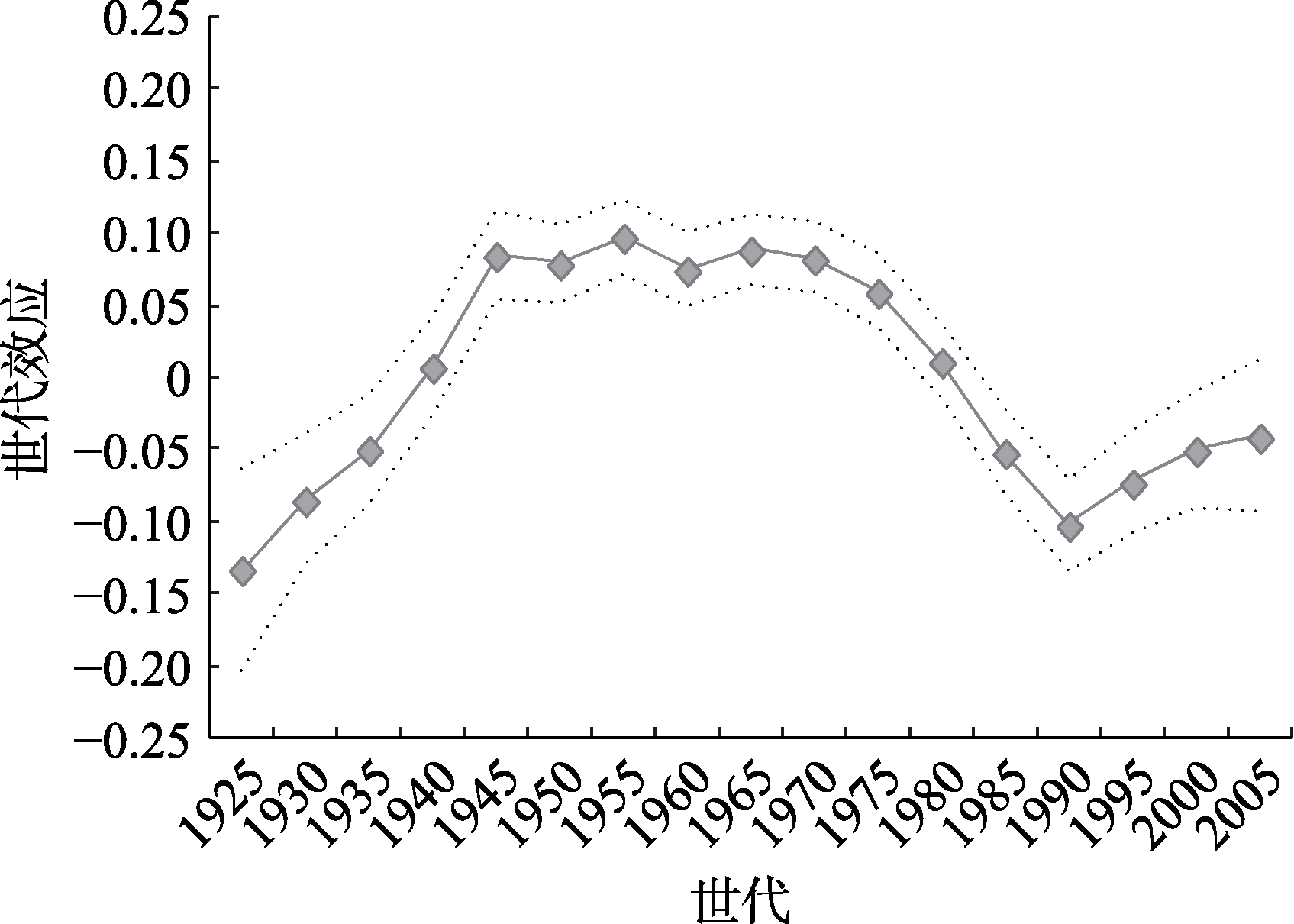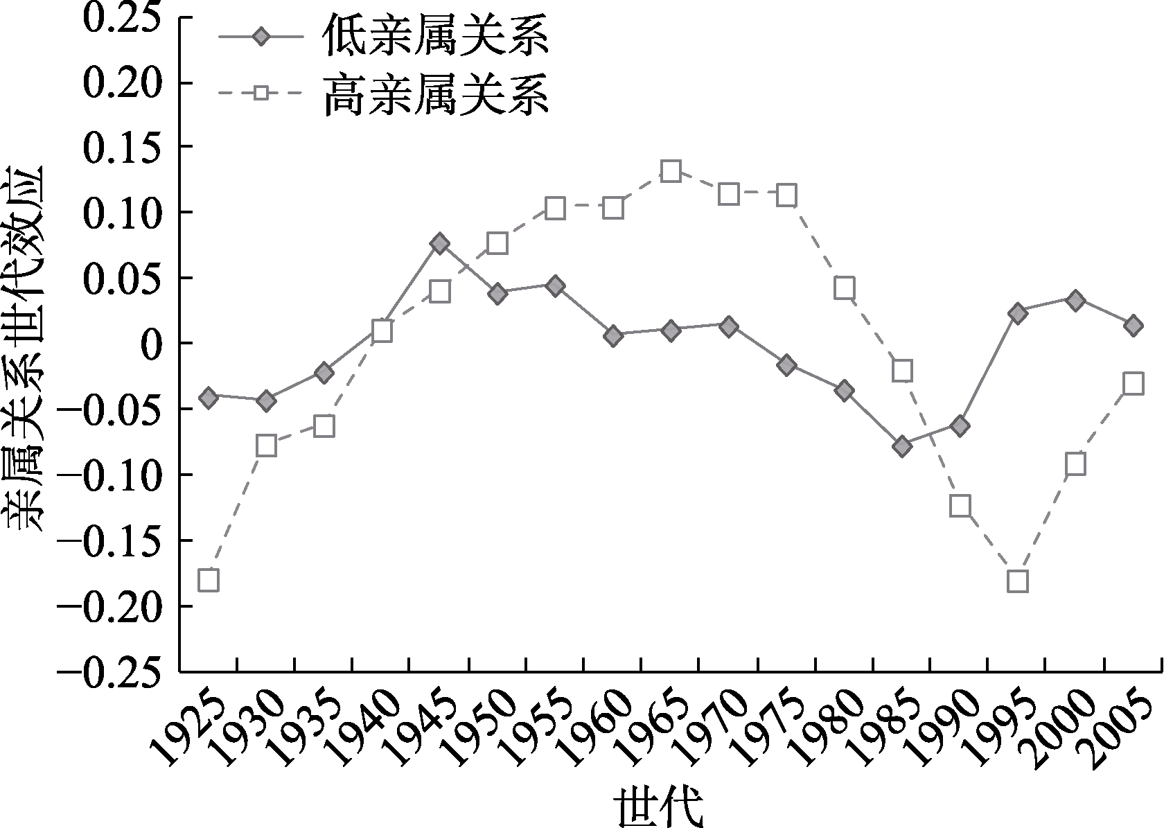 图12 世代效应的亲属关系差异 注:图9纵坐标轴“世代效应”表示不同世代对普遍信任水平的随机效应系数(${{\text{v}}_{0\text{k}}}$)。图10~12进一步分别纳入了户籍、教育水平、亲属关系等群体变量的固定效应(${{\gamma }_{9}}$)及它们对普遍信任水平的世代随机效应系数(${{\text{v}}_{9\text{k}}}$)。