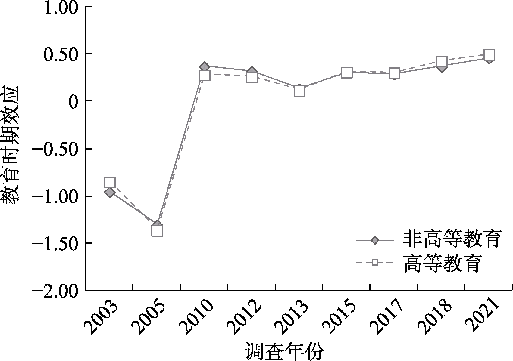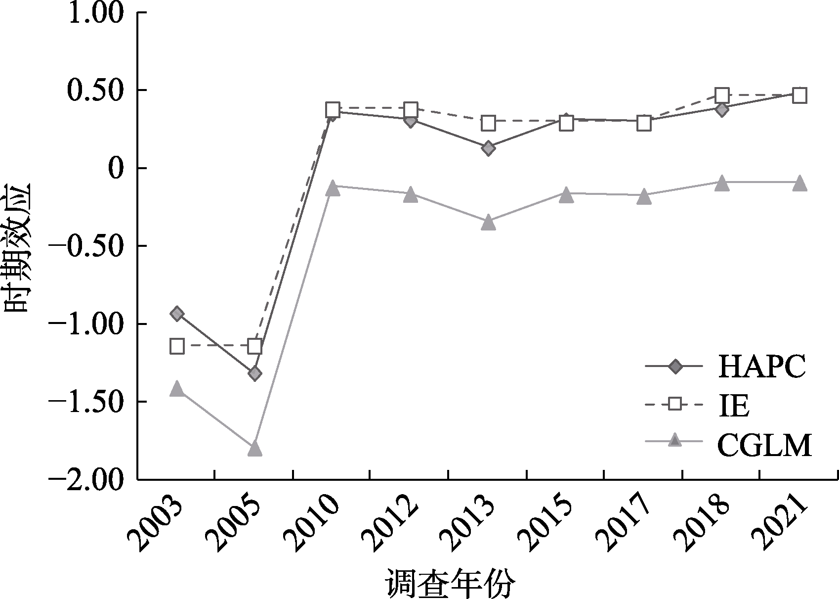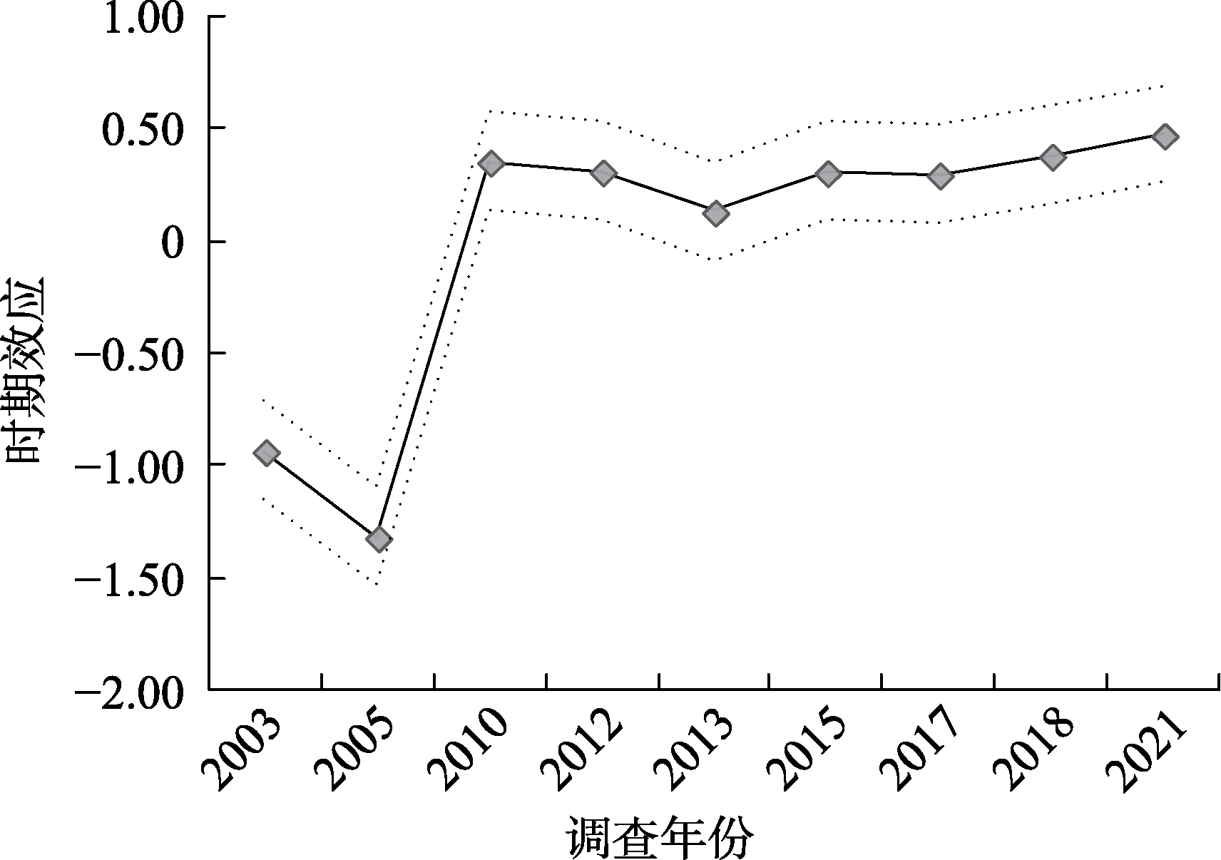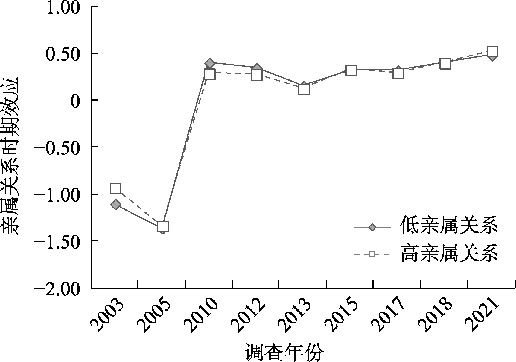 图8 时期效应的亲属关系差异 注:图5纵坐标轴“时期效应”表示不同调查年份对普遍信任水平的随机效应系数(${{\text{u}}_{0\text{j}}}$)。图6~8进一步分别纳入了户籍、教育水平、亲属关系等群体变量的固定效应(${{\gamma }_{9}}$)及它们对普遍信任水平的时期随机效应系数(${{\text{u}}_{9\text{j}}}$)。