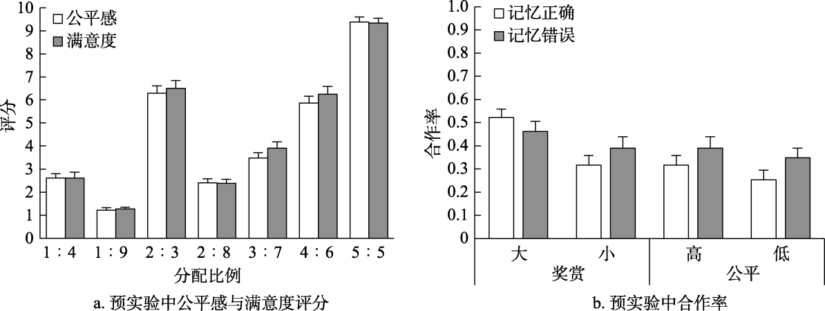 表1 预实验中不同条件下记忆成绩、信心判断和合作率的平均值(标准差)