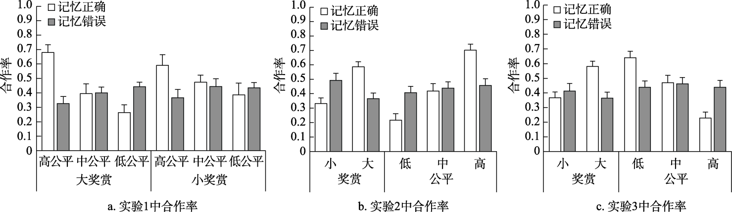 | 合作率(记忆正确) | 0.68(0.23) | 0.40(0.29) | 0.26(0.23) | 0.59(0.32) | 0.47(0.22) | 0.39(0.36) |