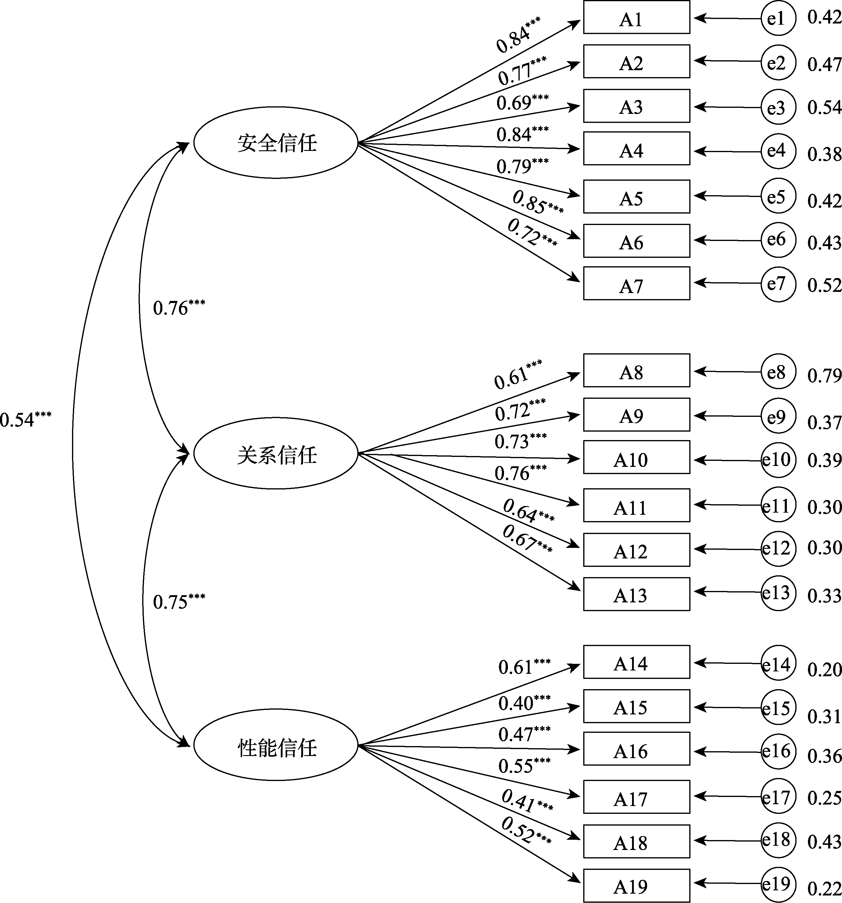 | 安全信任 (自编) | 4.10 (0.10) | 4.33 (0.08) | 3.77 (0.10) | 2.08 (0.08) | 改变方向 | 155.61*** | 0.55 |