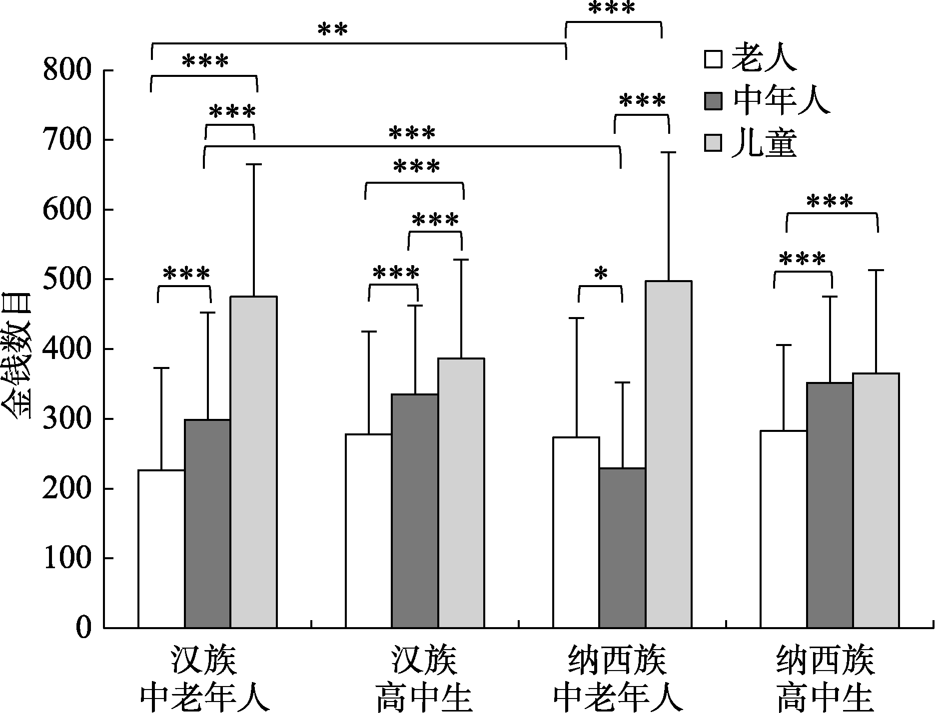 摘要: “贵壮贱老”是我国古代北方游牧民族的共性, “尊老爱幼”是古代华夏民族的习俗。汉族“胡化”和少数民族“汉化”是我国历史上文化融合的表现。通过两个实验, 本研究考察了不同年龄的河北汉族人和云南纳西族人在不同情境中对不同年龄者的保障行为和助人行为意愿。结果发现, 云南纳西族中老年人对老年人的保障行为和助人行为意愿更强烈, 汉族中老年人对中年人的保障行为和助人行为意愿更强烈。这表明, 在长期的文化融合过程中, 受华夏民族“尊老爱幼”的文化影响, 纳西族人的尊老意识变强了; 受少数民族“贵壮贱老”的习俗影响, 河北汉族人也兼具“贵壮”的特征。两民族的中老年人无论在何种情境下均将儿童放在保障行为和助人行为的第一位, 既体现了国人重视子嗣的伦理观, 也受现代化带来的“少子化”影响。两民族的高中生在多数情境下都优先选择保障或帮助儿童或父亲, 表明在当代社会, 民族间的性格取向差异正在消弭。整个研究表明, “胡化”与“汉化”潜移默化地影响着河北汉族人和云南纳西族人的文化心理, 中国各民族的文化心理是文化融合的结果。中国各民族的心理体现出“你中有我, 我中有你”的特点, 这为中华民族多元一体格局理论和陈寅恪的“化认说”提供了坚实的心理学证据。